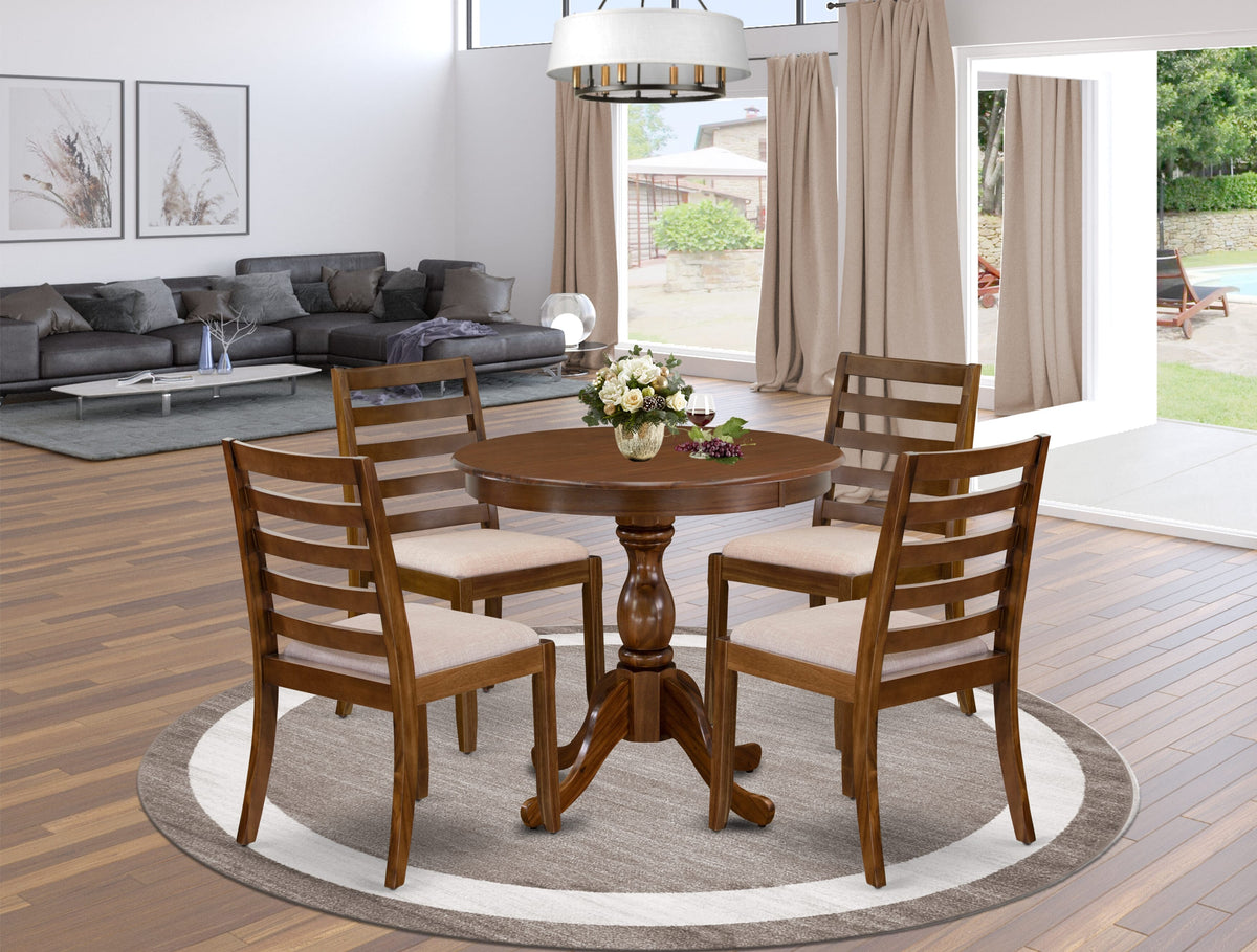 Introducing our 5-piece dining set, featuring a round table and 4 stackable chairs meticulously designed to seamlessly adapt to various settings and occasions. The stackable chairs provide practical space-saving benefits. Both the dining table and chairs radiate an elegant design, adding a touch of sophistication and contemporary allure to your living space. The table showcases a coordinated Antique Walnut finish on the tabletop and legs, perfectly complementing the stackable chairs finished in the same Antique Walnut hue for a cohesive aesthetic. These chairs come with comfortable Light Tan linen fabric seats, enhancing both the style and comfort of your dining area. Our carefully crafted dining set boasts a durable Rubberwood table and sturdy Acacia Wood chairs. The enduring quality and durability of the Rubberwood table ensure its lasting appeal, while the Acacia Wood chairs offer exceptional resilience, ensuring the set remains stylish, sturdy, and long-lasting, embodying enduring elegance and quality. Furthermore, our chairs feature premium Linen fabric seats, elevating their sophistication. Combined with a timeless ladder back design, they exude timeless elegance. The fabric's durability and easy maintenance guarantee lasting comfort and breathability, even with prolonged use, enhancing the overall appeal of the chairs.