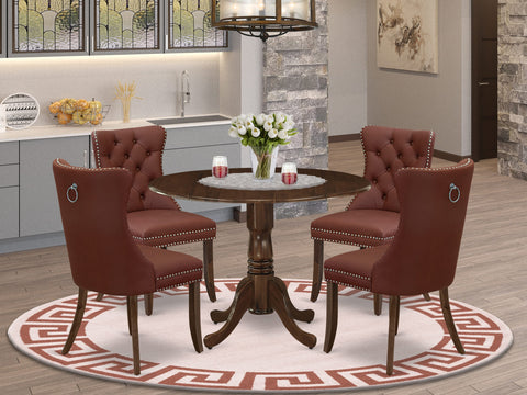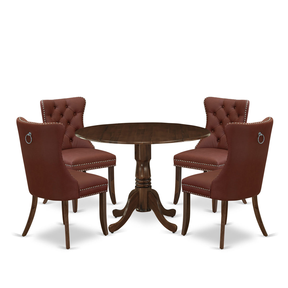 This exquisite 5-piece contemporary kitchen table set seamlessly blends elegance, strength, and practicality to elevate your dining occasions. The dining room set for your kitchen consists of a round table with a conveniently expandable Dropleaf tabletop, a robust pedestal base, and 4 kitchen dining chairs. Whether you're hosting family gatherings, entertaining friends, or simply enjoying casual meals, This collection introduces an element of sophistication to your home decor. Constructed from premium Asian wood, This dining table set features a dinner table with a charming Antique Walnut-style finish, elegantly paired with comfortable Burgundy dining chairs, each adorned with rustic Antique Walnut legs. This combination creates a charming rustic atmosphere in your dining area, establishing a cozy and welcoming environment for both your family and guests. The use of Asian wood ensures long-lasting durability, even with daily use, while The cushioned seats, upholstered in faux Leather, offer exceptional comfort, even during extended dining sessions. Assembling This kitchen table set is a straightforward task, thanks to its user-friendly design, which Includes all The necessary hardware and assembly instructions.