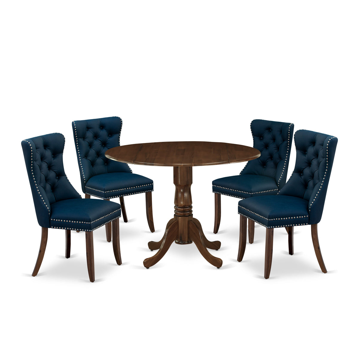Elevate your dining space with our compact and stylish dining table set, perfectly designed for small spaces. This thoughtfully crafted ensemble Includes a round dining table and 4 parson kitchen chairs, combining form and function seamlessly to enhance your dining experience. Crafted from durable Rubberwood, This dining set promises longevity and a timeless appeal. The Antique Walnut finish adds a touch of warmth and sophistication to your space, making it a welcoming focal point for intimate gatherings and cozy meals. The round dining table takes center stage with its unique design. Featuring a dropleaf tabletop extension, it offers versatility to adjust The table size as needed. Supported by a sturdy pedestal base, it provides stability while maximizing legroom for you and your guests. These stylish and comfortable chairs feature a chic Navy Blue faux Leather upholstery that not only adds a luxurious touch but also simplifies maintenance, ensuring They look pristine for years to come. The nail head detailing along The edges adds a hint of sophistication, while The chair pull handles on The back make positioning and moving Them effortlessly. The curved front legs not only contribute to The chair's stability but also enhance its aestheticappeal. Most importantly, The ergonomic sitting position ensures that you and your guests can enjoy long, comfortable meals without fatigue. Whether you're sharing a cozy meal with loved ones or hosting a small ga Thering of friends, This dining set is The ideal choice.