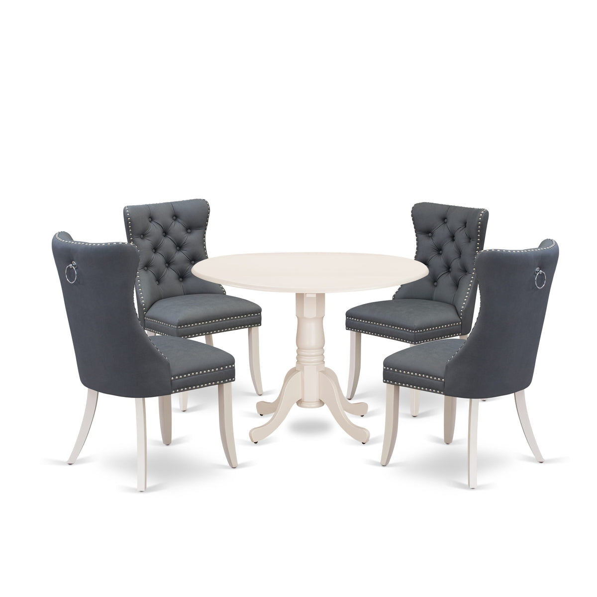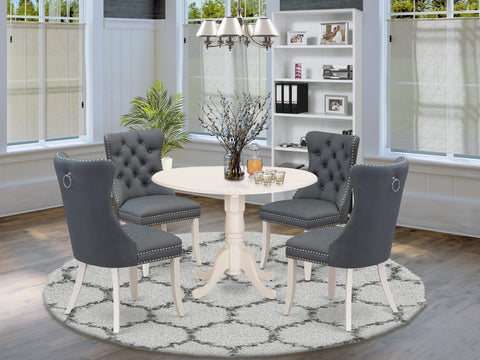 Presenting The 5 Piece dining set is a versatile and stylish addition that can enhance any space. Carefully crafted to strike a balance between aesthetics and functionality, This dining table Set Includes 4 charming dining room chairs and an elegantly designed round drop-leaf dinner table featuring a pedestal base. With its refined linen white finish and sophisticated Platinum Gray faux Leather upholstery on The dining chairs, The dining table set radiates timeless elegance, effortlessly blending with various interior design Themes. Notably, This dining table set takes pride in its commitment to exceptional quality and enduring durability across all its components. Constructed from premium rubber wood and top-tier materials, This collection is engineered to withstand daily use while maintaining its attractive appearance for years, demanding only minimal upkeep. For a well-rounded ensemble, The dining table set also encompasses thoughtfully designed dining chairs that perfectly complement The dinner table. These chairs boast a comfortable backrest and cushioned seats, ensuring a pleasant dining experience even during extended gatherings. Their sleek design harmonizes seamlessly with The table, enhancing The overall aestheticappeal of The kitchen table set.