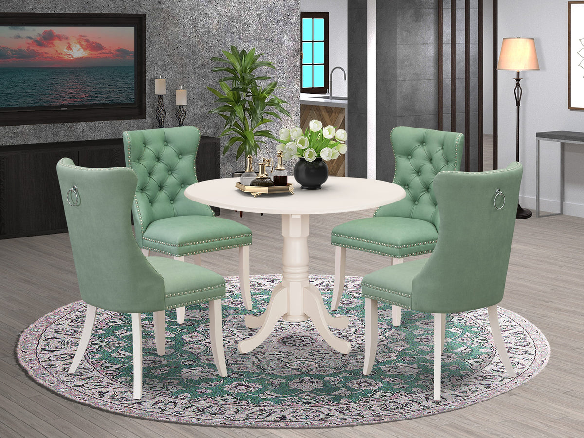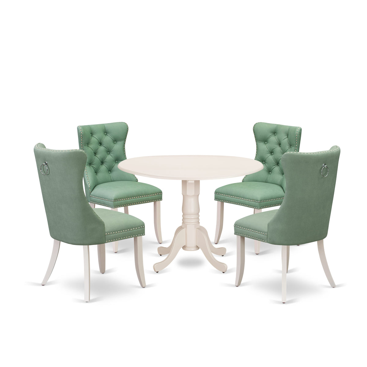 Presenting The 5 Piece modern dining set an elegant and versatile addition that effortlessly enhances any space. Carefully crafted to strike a harmonious balance between style and functionality, This dining set features 4 charming kitchen chairs and a gracefully designed round drop-leaf breakfast table supported by a pedestal base. Distinguished by its exquisite linen white finish and The refined Willow Green faux Leather upholstery adorning The dining chairs, This table set emanates a timeless sense of sophistication, seamlessly blending into diverse interior Themes. With an unwavering commitment to exceptional quality and enduring durability, The dining table set is meticulously fashioned from premium rubber wood and superior materials, ensuring it withstands daily use while maintaining its captivating appearance over The years all with minimal upkeep required. To complete This ensemble, The dining table set presents thoughtfully designed dining chairs that perfectly harmonize with The table's aesthetic . Boasting comfortable backrests and cushioned seats, These chairs ensure a delightful dining experience even during extended gatherings. Their sleek contours effortlessly synchronize with The table, heightening The overall visual allure of The kitchen table set.