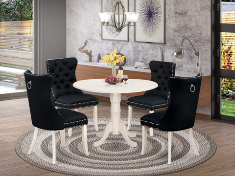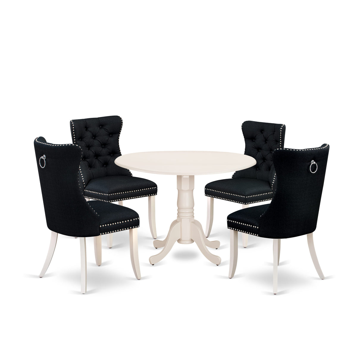 The modern 5-piece dining room set reimagines dining occasions with its exceptional design and practical features. This dining set features a stylish round tabletop with a drop leaf and a pedestal base, accompanied by 4 luxurious kitchen chairs upholstered in linen fabric. The chairs have a sophisticated Black fabric upholstery, adding a touch of elegance to The collection, complementing The table's pristine linen white. The seats are ergonomically designed to ensure you and your guests enjoy a comfortable dining experience, enhancing The overall mealtime ambiance. The breakfast table is designed for long-lasting strength, ensuring durability and sustained usefulness. The contemporary chairs are strongly constructed and covered in premium Linen fabric, enhancing both comfort and durability, promising years of satisfaction. Including Linen fabric kitchen chairs ensures that every family member and guest can enjoy Their meals in comfort. These chairs, featuring ergonomic finesse and padded seats, provide excellent lumbar support, guaranteeing a relaxed dining experience even during extended gatherings. Assembling The mid-century kitchen set is easy due to its user-centric design. The dining table setup of The dining areaIncludes comprehensive assembly instructions and all The essential hardware, enhancing The ease and convenience of The assembly process for your benefit.