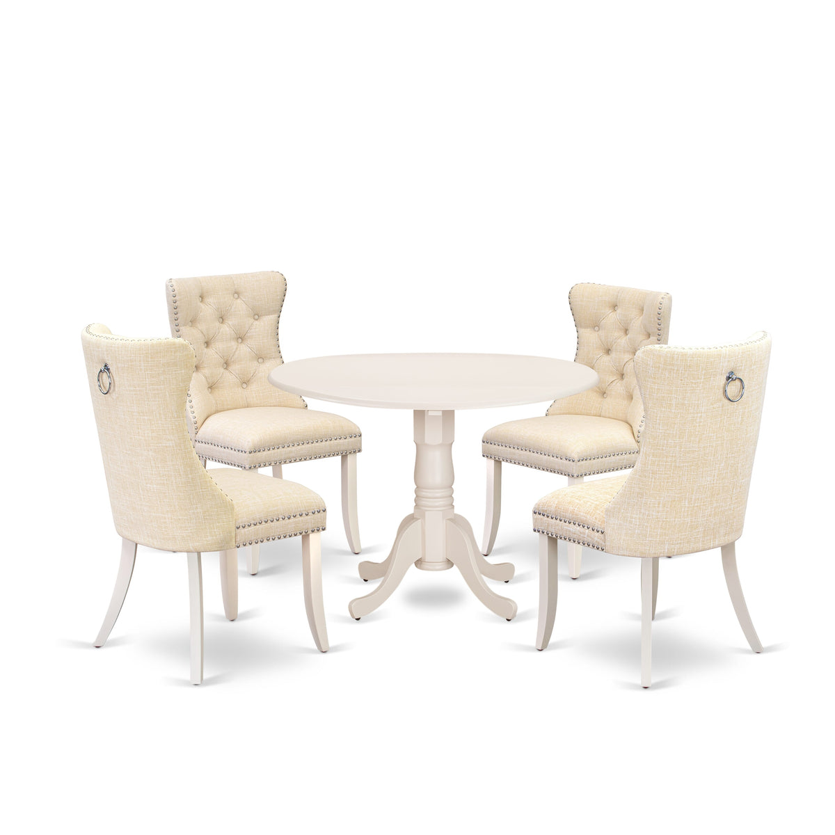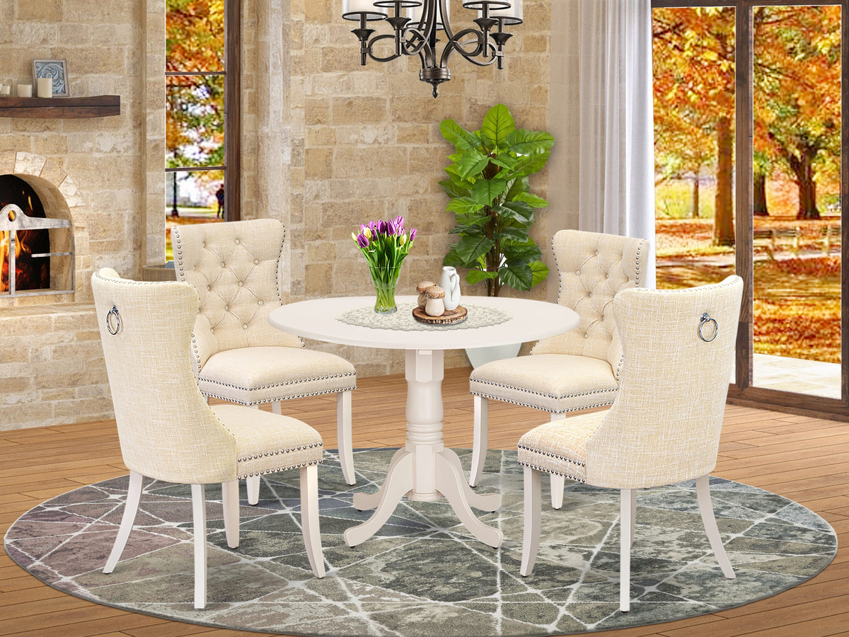 The innovative 5-piece modern dining set reimagines dining occasions by blending exceptional design with functional features. This dining table set presents a sophisticated circular tabletop with a drop leaf and a pedestal base, accompanied by 4 luxurious kitchen chairs upholstered in linen fabric. The chairs boast an elegant light beige linen fabric covering that adds a touch of refinement to The collection, complementing The table's pristine linen white appearance. The ergonomically designed seats ensure both you and your guests enjoy a comfortable dining experience, elevating The overall mealtime ambiance. Crafted for enduring strength, The breakfast table is built to guarantee resilience and long-lasting utility. The sturdy construction of The contemporary chairs, coupled with Their high-quality Linen fabric upholstery, enhances Their comfort and durability, ensuring years of satisfaction. By incorporating These modern dining chairs with Linen fabric, The dining table set ensures that every family member and guest can enjoy Their meals in comfort. The dining room chairs are meticulously designed with ergonomic finesse and padded seating, providing excellent lumbar support for a leisurely dining experience even during extended gatherings. Setting up The kitchen table set is a breeze, thanks to its user-centered design. The dining area setupIncludes thorough assembly guidelines and all The essential hardware, streamlining The process of assembling and making it more convenient for you.