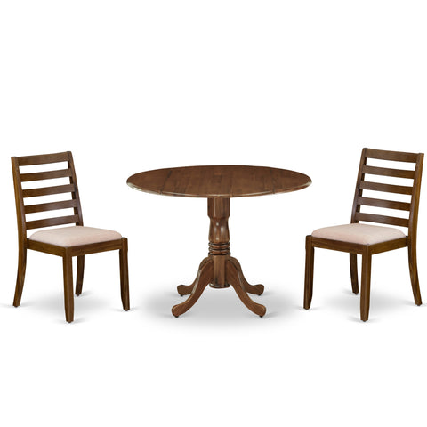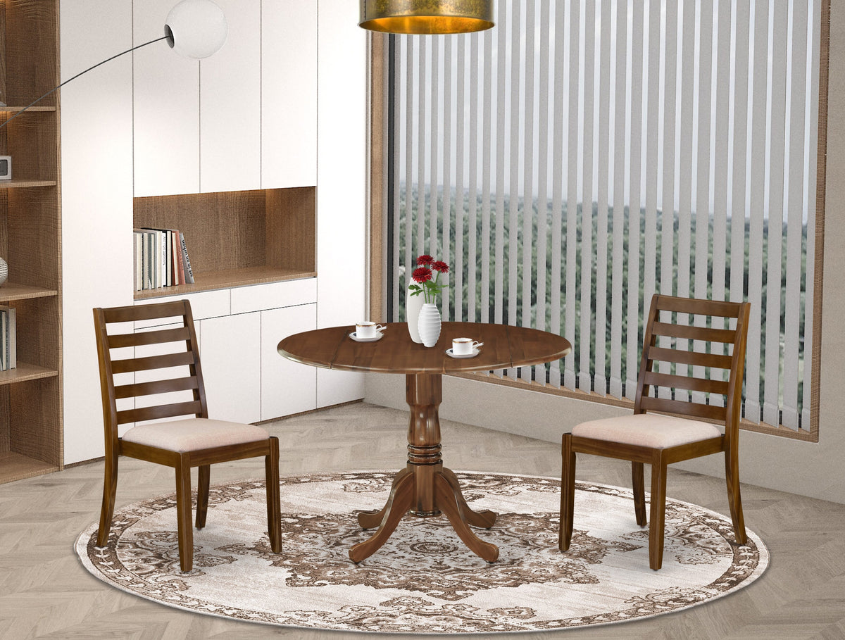 East West Furniture DLX13-AWA-04 3-piece Modern Dining Table set includes a Round Kitchen Table and 2 Light Tan Linen Fabric stackable Dining Chair Sale