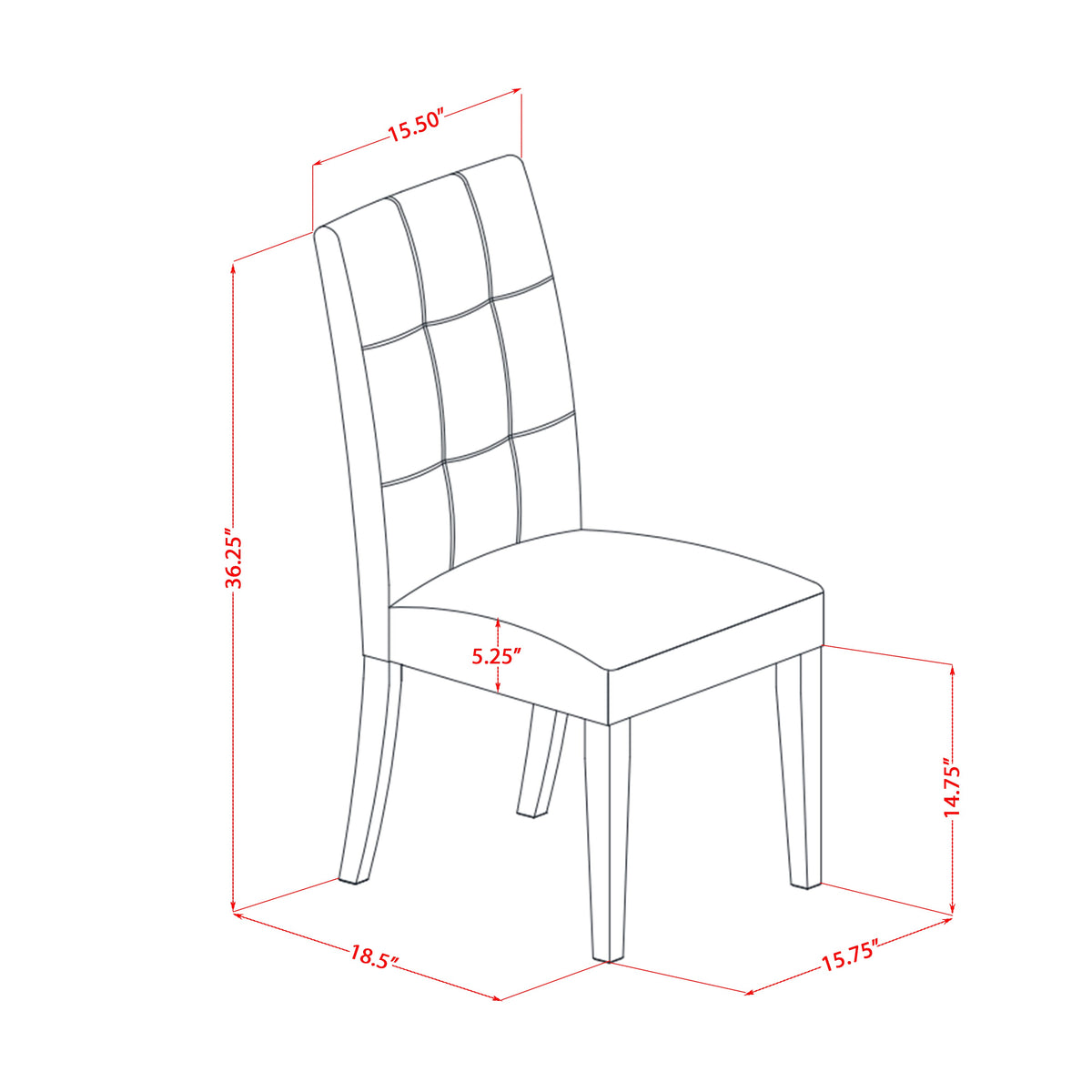 • Chairs Dimensions: Length: 18.05; Width: 15.75; Height: 36.25.