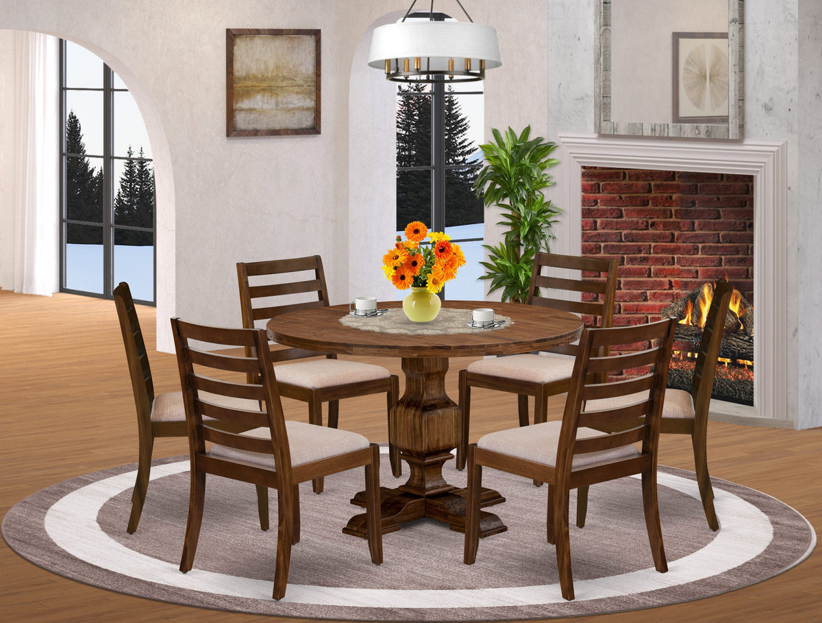 East West Furniture I3X17-0N-04 7-piece Dining Room Table Set included a Round Kitchen Table and 6 Light Tan Linen Fabric stackable Chair Sale