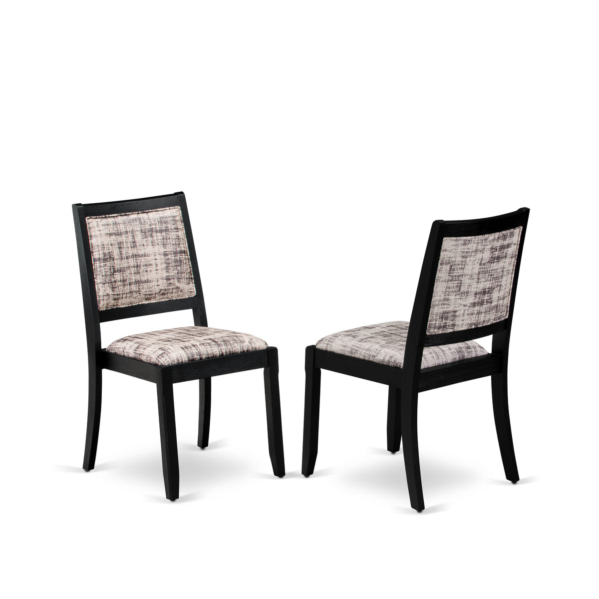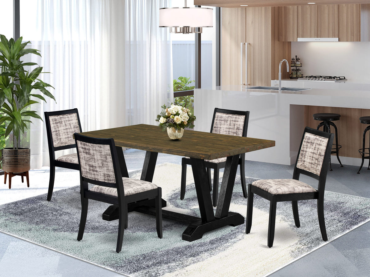 This elegant kitchen table set enhances the atmosphere of your home decor with its timeless charm. Consisting of a robust dinner table and 4 stackable dining chairs, each featuring a classic design, it adds a touch of sophistication to your dining area. The dining table boasts sleek V-shaped legs finished in Wire Brushed Black, adding refinement to the room. Its Distressed Jacobean tabletop creates a striking visual contrast, enhancing the overall appeal of the dining set. The dining room chairs, upholstered in premium White and Gray Pattern Faux Leather, offer a blend of style and comfort that complements the kitchen table's finish perfectly. With legs mirroring the design of the rectangle wooden table, they maintain a cohesive look with their Wire Brushed Black finish. Crafted from durable rubberwood, this dining room set is built to withstand daily use, ensuring years of reliable service. Whether you're hosting a formal dinner or enjoying a casual family meal, this set seamlessly combines elegance with practicality, making it an ideal addition to any dining space. Elevate your dining room's ambiance with this enduring and refined dining table set.