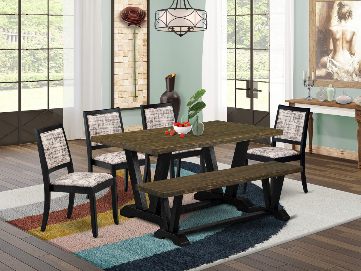 This modern dining table set elevates the ambiance of your home décor with its timeless appeal. Comprising a sturdy dining table, a bench, and 4 stackable kitchen chairs, each boasting a classic design, it imbues your dining area with an air of refinement. The wooden table and bench feature sleek V-shaped legs finished in Wire Brushed Black, imparting a sense of sophistication to the room. Its Distressed Jacobean top creates a captivating visual contrast, enhancing the overall allure of the set. Upholstered in premium White and Gray Pattern Faux Leather, the kitchen chairs offer a harmonious blend of style and comfort that perfectly complements the dining table's finish. With legs echoing the design of the wooden table, they maintain a cohesive aesthetic with their Wire Brushed Black finish. Crafted from durable rubberwood, this dining table set is built to endure daily use, ensuring years of dependable service. Whether you're hosting a formal dinner or enjoying a casual family meal, this kitchen set seamlessly combines elegance with practicality, making it an ideal addition to any dining space. Enhance your dining room's ambiance with this enduring and refined dining room set.