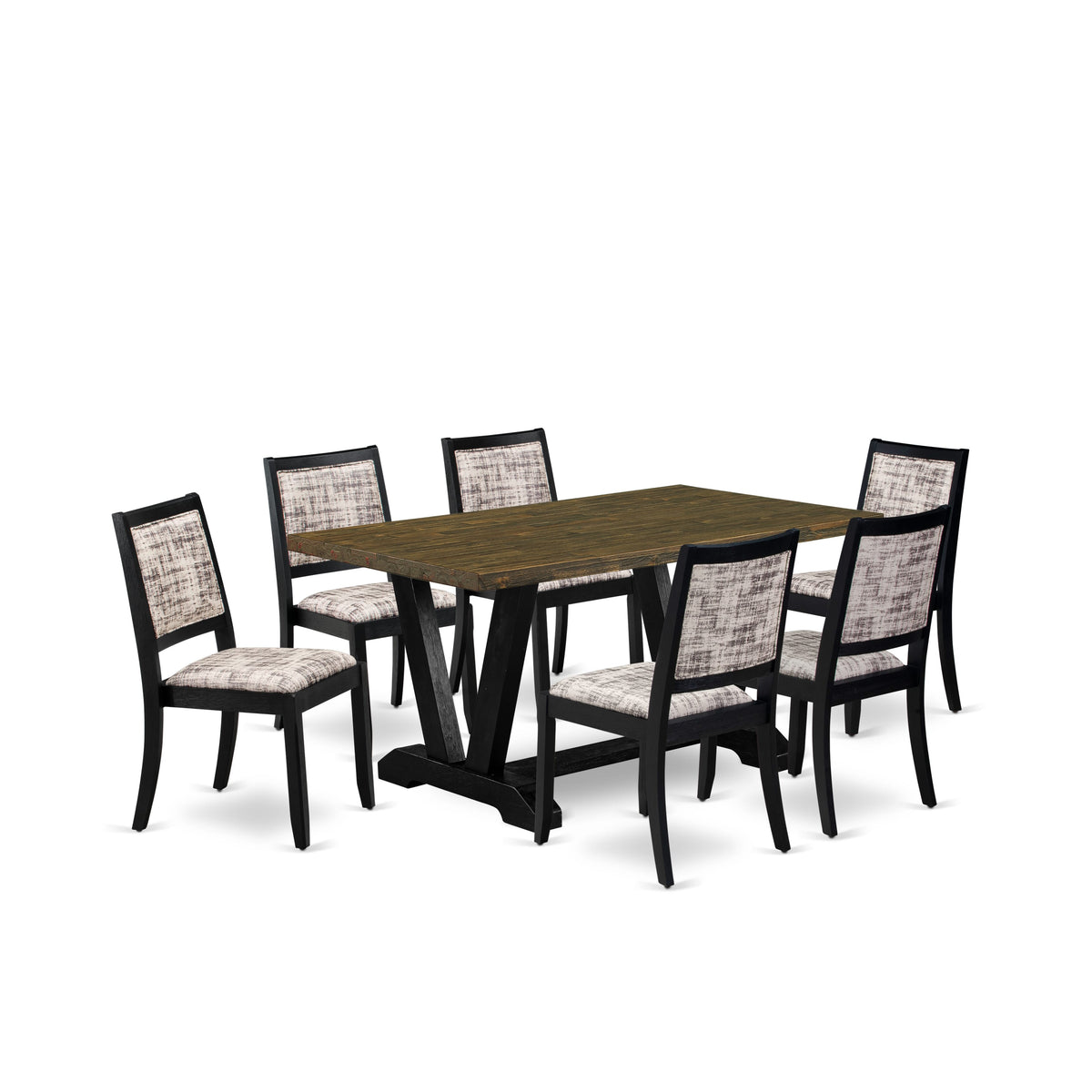 This contemporary kitchen table set enhances the atmosphere of your home decor with its timeless charm. Including a robust dining table and 6 stackable dining chairs, each boasting a traditional design, it infuses your dining area with an essence of sophistication. The dining room table showcases sleek V-shaped legs finished in Wire Brushed Black, adding a touch of elegance to the room. Its Distressed Jacobean tabletop creates a striking visual contrast, enriching the overall appeal of the kitchen table set. Upholstered in high-quality White and Gray Pattern Faux Leather, the dining chairs offer a seamless fusion of style and comfort that perfectly complements the kitchen table's aesthetics. With legs mirroring the design of the dinner table, they maintain a unified look with their Wire Brushed Black finish. Constructed from sturdy rubberwood, this breakfast table set is designed to withstand daily use, ensuring years of reliable service. Whether you're hosting a formal dinner or enjoying a casual family meal, this dining set effortlessly combines sophistication with functionality, making it an excellent addition to any dining space. Elevate the ambiance of your dining room with this enduring and refined kitchen table set.