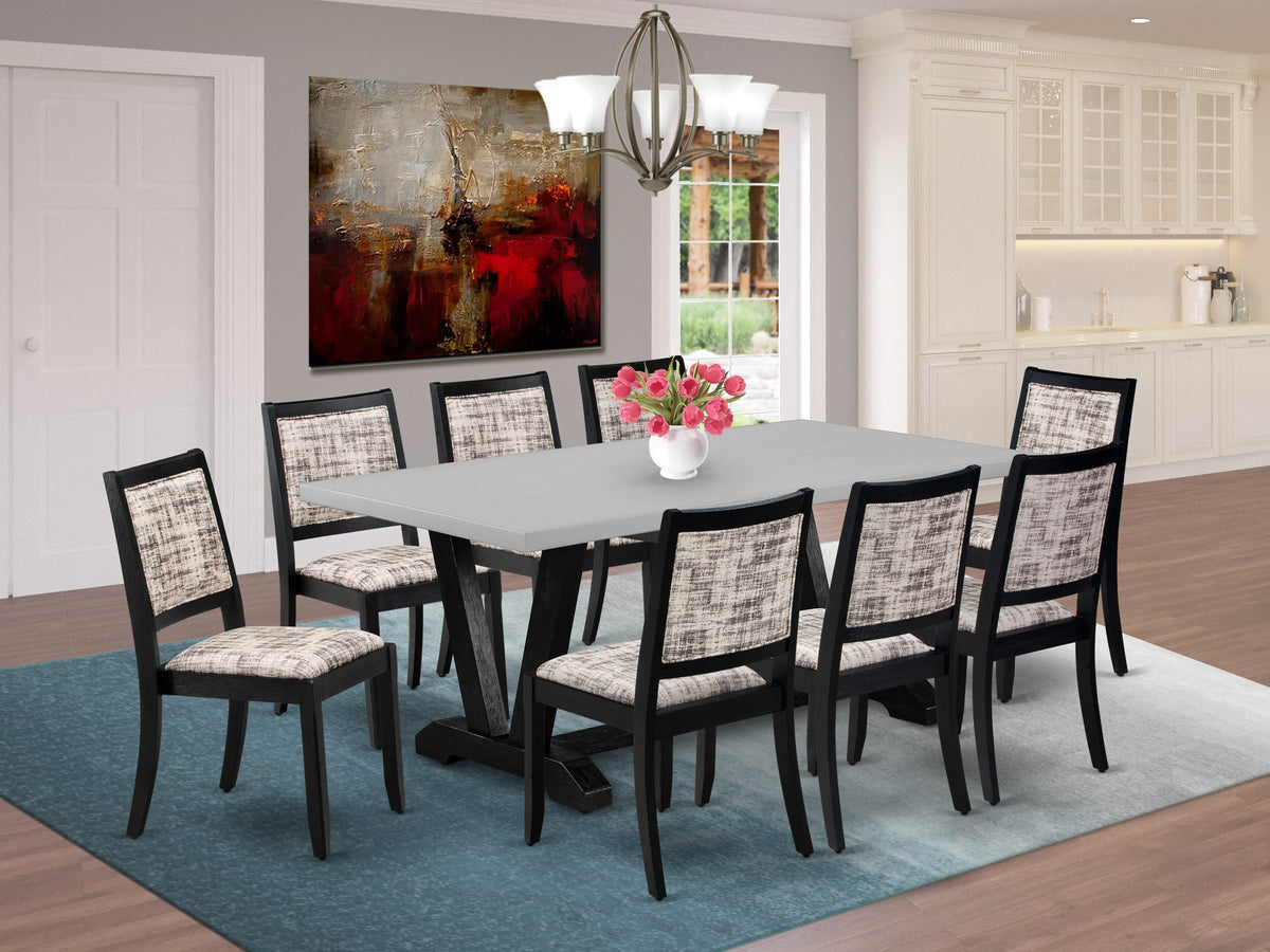This dining room set elevates the atmosphere of your home décor with its timeless charm. Comprising a sturdy dinner table and 8 stackable dining chairs, each component exudes a timeless elegance that enriches your dining area with a touch of sophistication. The breakfast table boasts sleek V-shaped legs finished in Wire Brushed Black, adding a refined accent, while its Cement tabletop offers a striking contrast, enhancing the allure of the kitchen table set. Adorned in high-quality White and Gray Pattern Faux Leather upholstery, the dining chairs blend style with comfort, complementing the dinner table's aesthetic. With legs mirroring the table's design and finished in Wire Brushed Black, they ensure a cohesive look. Crafted from durable rubberwood, this dining table set is designed to withstand daily use, promising years of dependable service. Whether hosting a formal dinner or enjoying a casual family meal, this dining table set seamlessly combines sophistication with practicality, making it an outstanding addition to any dining space. Elevate the ambiance of your dining area with this timeless and refined dining table set.