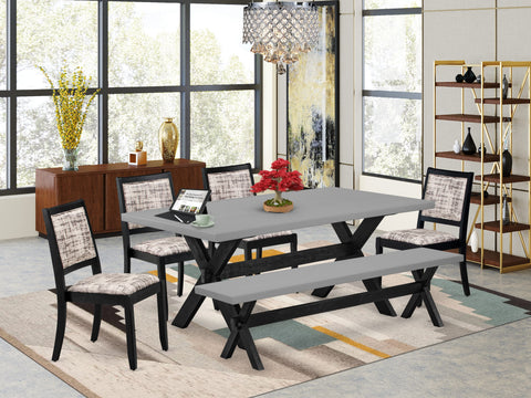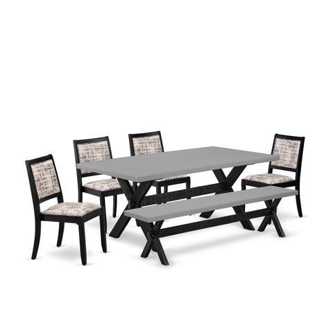 This kitchen table set elevates the elegance of your home decor, enriching the overall atmosphere of your living area. Complete with a robust wooden table, a bench, and 4 stackable kitchen chairs, each element emanates timeless charm and harmonizes effortlessly with any dining arrangement. The dining table and bench feature sleek X-style legs finished in Wire Brushed Black, embodying refinement, while the Cement top provides a striking contrast, emphasizing the allure of the entire set. The accompanying dining chairs seamlessly blend comfort and style, boasting premium White and Gray Pattern Faux Leather upholstery that radiates warmth and promotes relaxation, perfectly complementing the tabletop's tones. Their stackable design mirrors the sophistication of the dining table legs, adorned with a matching Wire Brushed Black finish for a unified appearance. Crafted from durable rubberwood, this dining table set is built to withstand daily use, ensuring enduring satisfaction. Whether hosting a formal dinner or enjoying a casual family meal, this set seamlessly merges elegance with functionality, effortlessly integrating into any dining space. Elevate your dining experience with this enduring and refined dining table set.