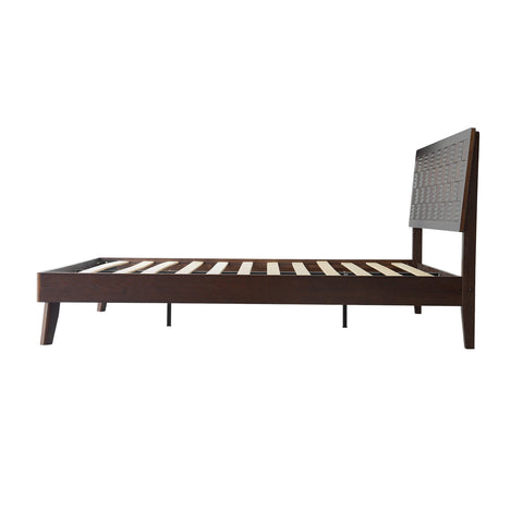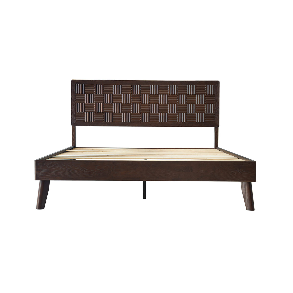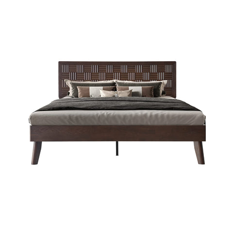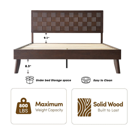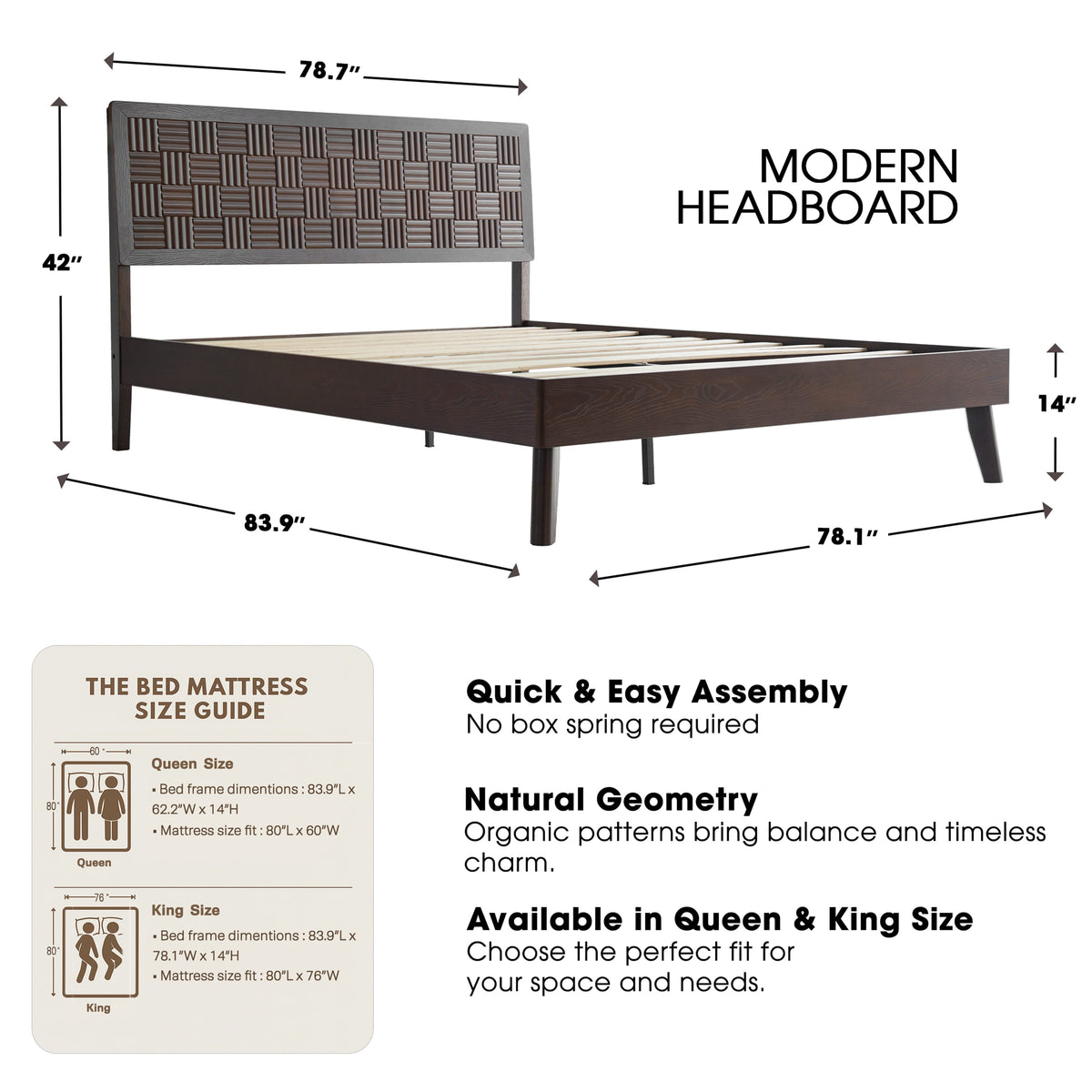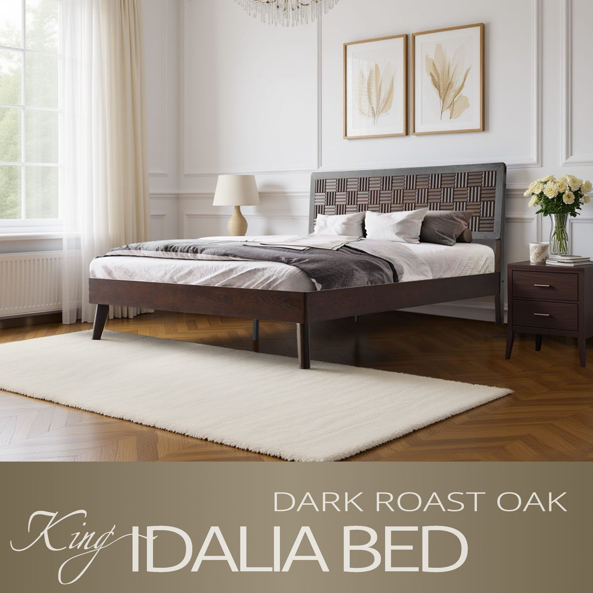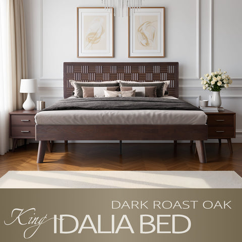 Bring lasting beauty and reliable comfort to your bedroom with the Idalia King Size Bed Frame, making it the highlight of your space. Expertly crafted from 100% solid wood, it features a rich, Deep Dark Roast Oak finish that shows the natural beauty of real wood grain. The modern headboard with its Geometric Pattern adds a touch of fresh style, while the slightly angled backrest offers cozy support for reading or resting after a long day. Designed with a sturdy 12-slat wooden platform reinforced by strong metal support legs, the Idalia Bed gives steady balance and a quiet night’s sleep, no box spring needed. With 8.3 inches of under-bed clearance, you’ll have enough space for easy cleaning and extra storage. Every detail, from the smooth surface to the neat screw covers, reflects East West Furniture’s focus on quality and design. Light in weight yet strong in build, the Idalia Bed Frame combines wood strength, modern design, and comfort, making your bedroom feel warm and inviting.