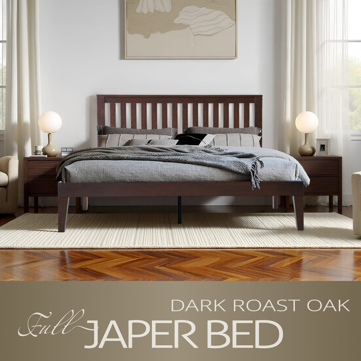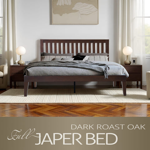 Enhance your bedroom’s style and comfort with the Japer Full-Size Bed Frame, expertly crafted from 100% Hevea Wood (Rubberwood) for exceptional strength, durability, and natural beauty. The minimalist slatted headboard and rich Dark Roast Oak finish bring warmth and refined sophistication to both classic and contemporary spaces. Its 12-slat rubberwood platform, reinforced with sturdy metal center legs, ensures superior stability and quiet, noise-free support no box spring required. With an impressive weight capacity of up to 800 lbs, the Japer Bed offers reliable support and long-lasting comfort. Every detail from the smooth finish and elegant back panel to the neat screw covers reflects East West Furniture’s commitment to quality craftsmanship. The 8.5-inch under-bed clearance provides ample storage space, while the 6.9-inch gap beneath the bottom rail allows for effortless cleaning. Easy to assemble and built to endure, the Japer Bed seamlessly combines minimalist design, robust construction, and timeless elegance perfect for creating a cozy and stylish bedroom retreat.