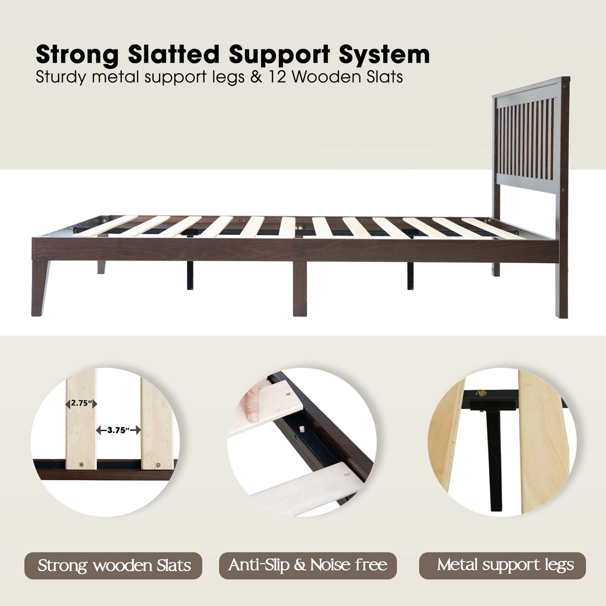 • Platform Support: 12 Durable Wooden Slats + Metal Center Legs