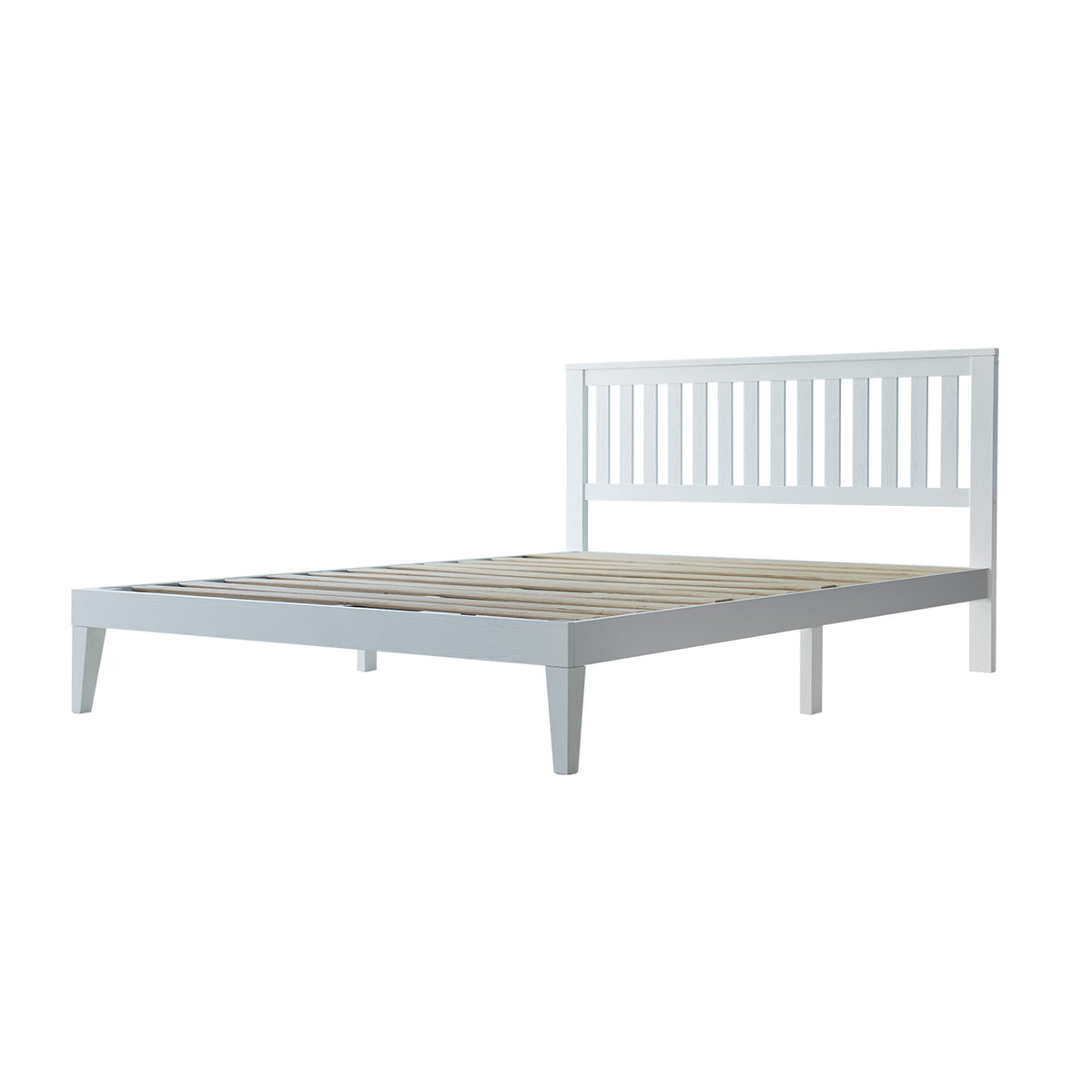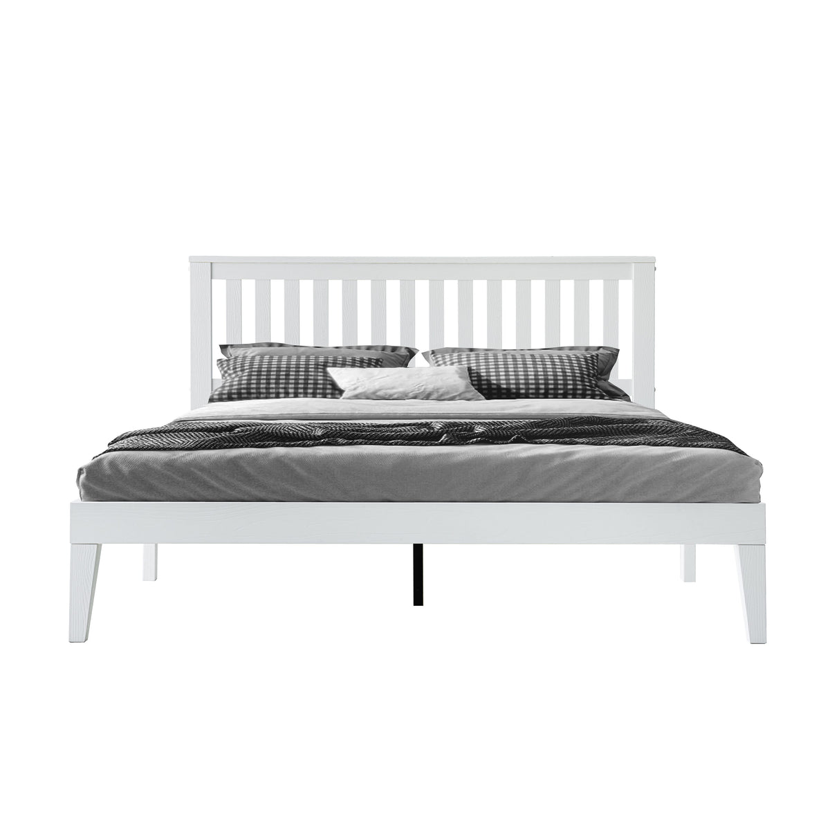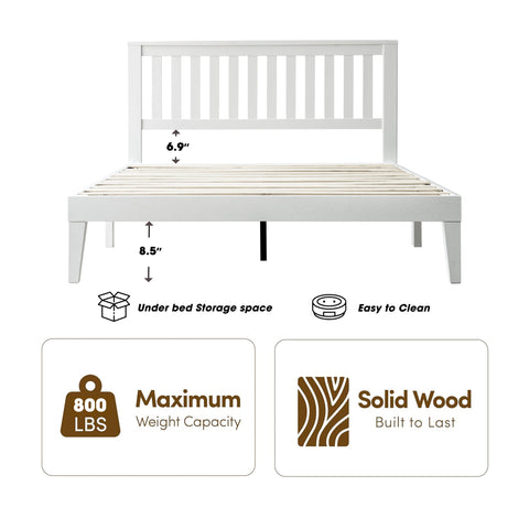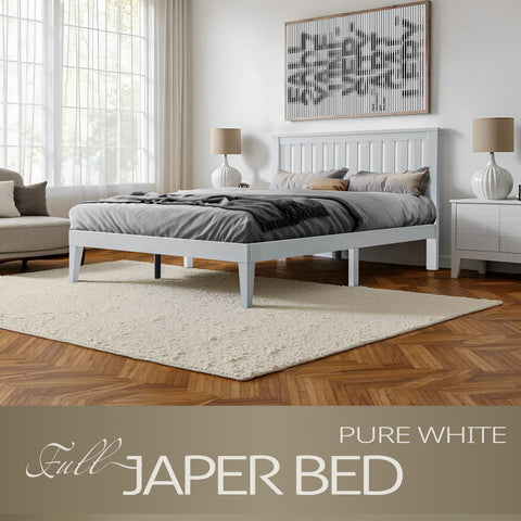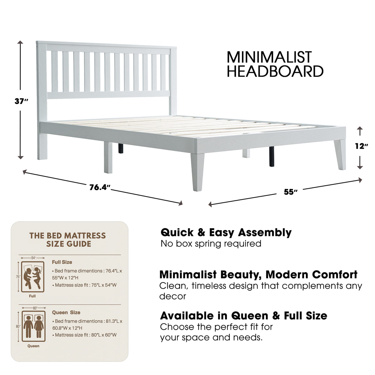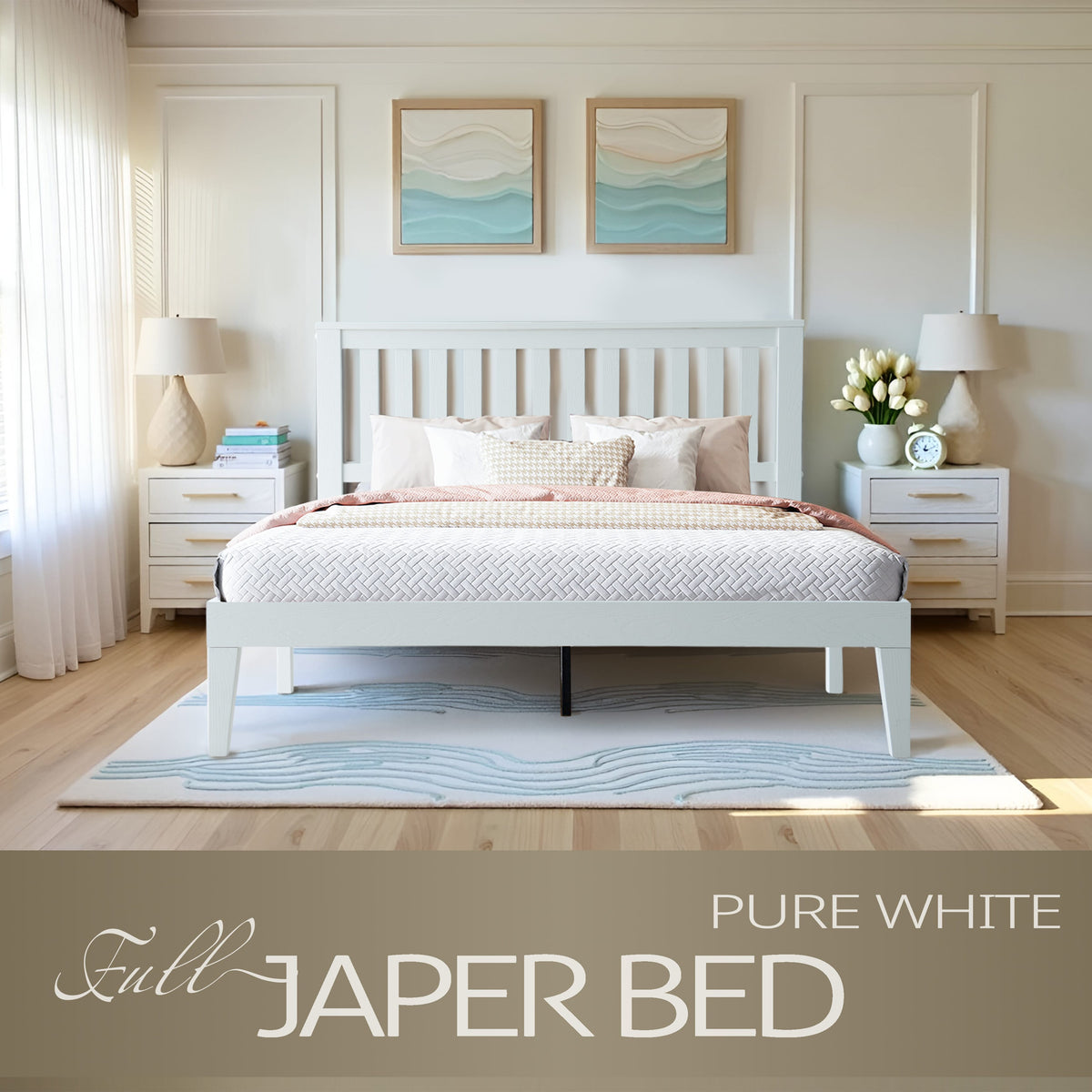 Upgrade your bedroom with the timeless elegance of the Japer Full-Size Bed Frame, crafted from 100% Hevea solid wood for lasting strength, durability, and natural beauty. Its minimalist slatted headboard and rich Pure White finish add warmth and sophistication, perfectly complementing both modern and traditional interiors. The 12-slat solid wood (Rubberwood) platform, reinforced with sturdy metal center legs, provides exceptional stability and silent, noise-free support no box spring required. With a weight capacity of up to 800 lbs, the Japer Bed ensures reliable support and long-lasting comfort for restful nights. Attention to detail is evident in every aspect, from the smooth finish and refined back panel to the neatly concealed screw covers, reflecting East West Furniture’s commitment to craftsmanship. An 8.5-inch under-bed clearance offers practical storage space, while the 6.9-inch gap beneath the bottom rail allows for easy cleaning. Stylish, durable, and easy to assemble, the Japer Bed combines minimalist design, solid construction, and timeless sophistication making it the perfect centerpiece for a cozy and elegant bedroom retreat.