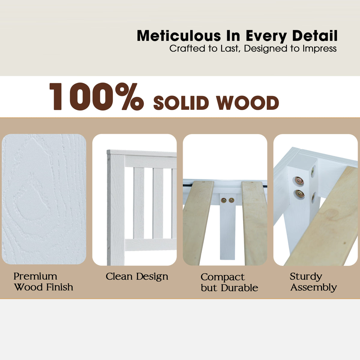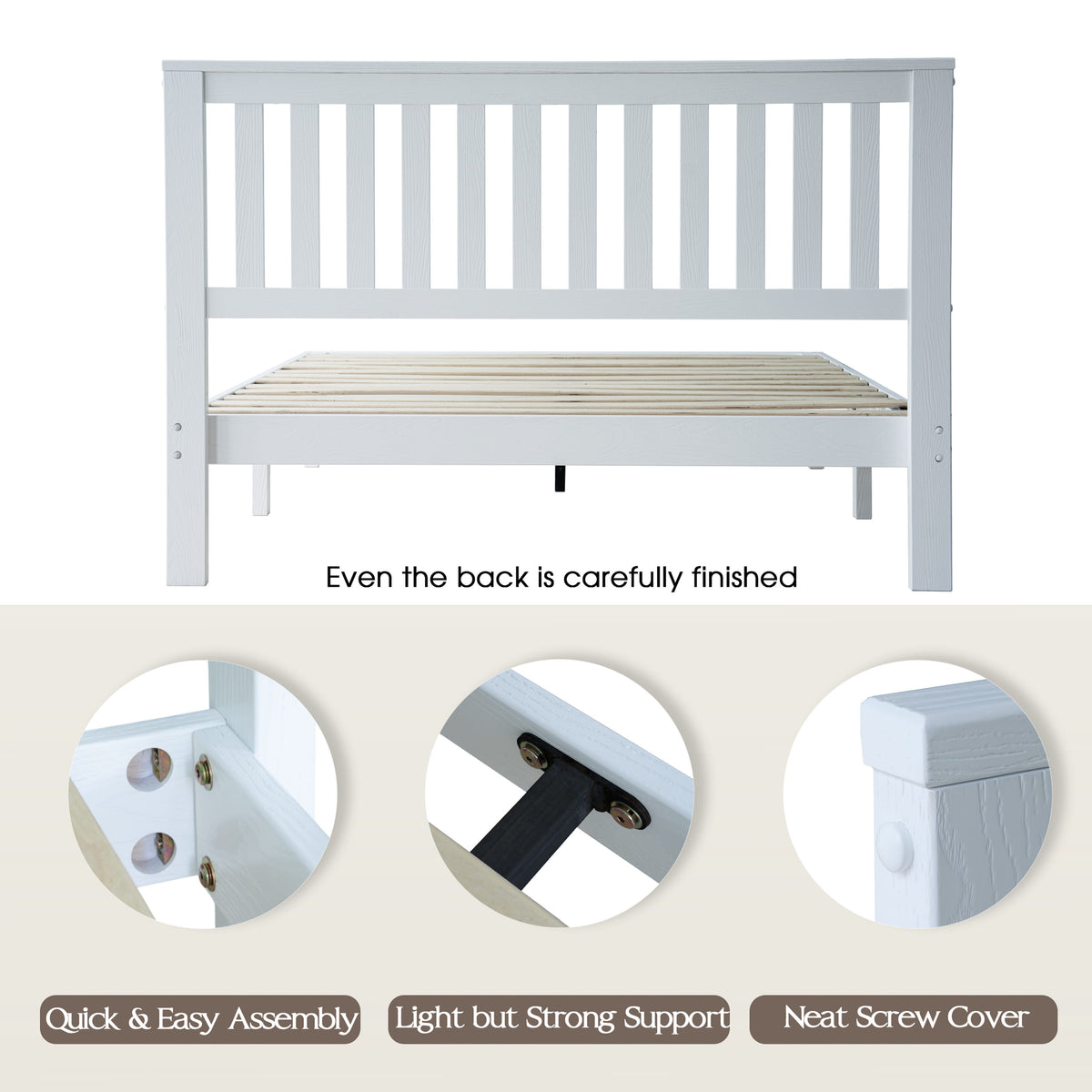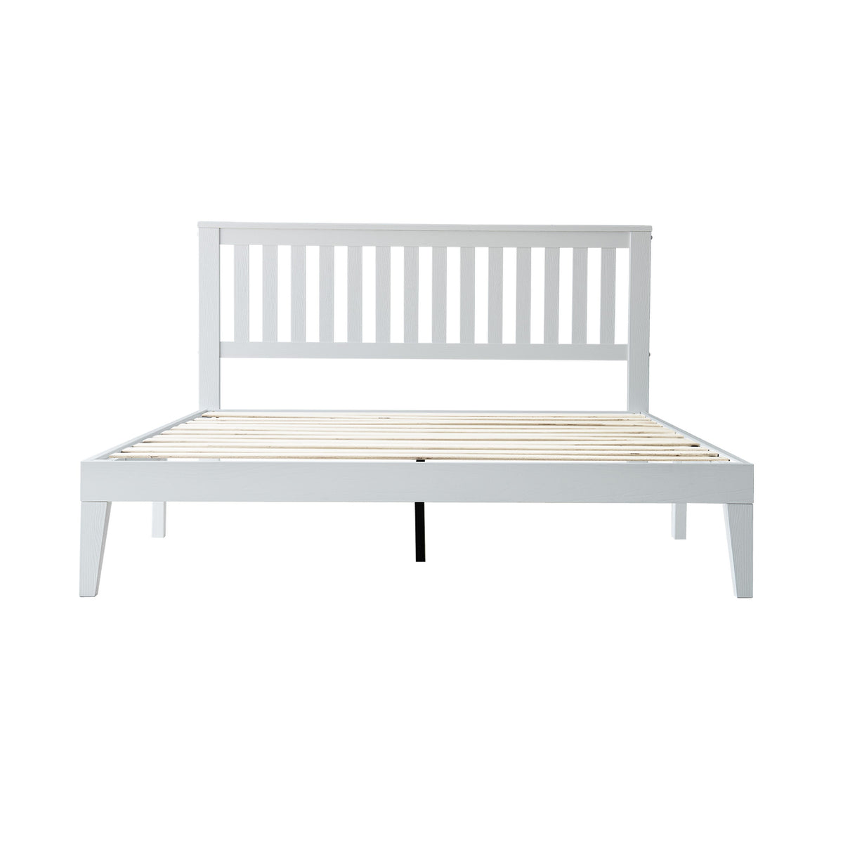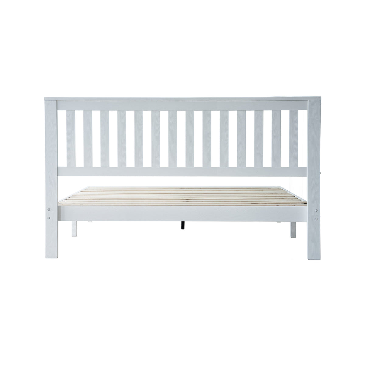 Upgrade your bedroom with the timeless elegance of the Japer Full-Size Bed Frame, crafted from 100% Hevea solid wood for lasting strength, durability, and natural beauty. Its minimalist slatted headboard and rich Pure White finish add warmth and sophistication, perfectly complementing both modern and traditional interiors. The 12-slat solid wood (Rubberwood) platform, reinforced with sturdy metal center legs, provides exceptional stability and silent, noise-free support no box spring required. With a weight capacity of up to 800 lbs, the Japer Bed ensures reliable support and long-lasting comfort for restful nights. Attention to detail is evident in every aspect, from the smooth finish and refined back panel to the neatly concealed screw covers, reflecting East West Furniture’s commitment to craftsmanship. An 8.5-inch under-bed clearance offers practical storage space, while the 6.9-inch gap beneath the bottom rail allows for easy cleaning. Stylish, durable, and easy to assemble, the Japer Bed combines minimalist design, solid construction, and timeless sophistication making it the perfect centerpiece for a cozy and elegant bedroom retreat.