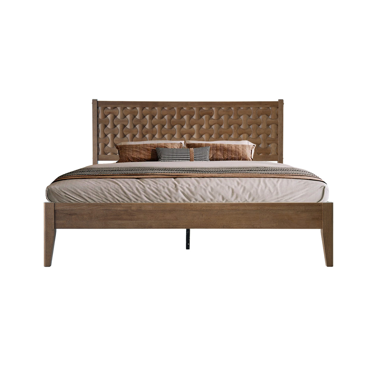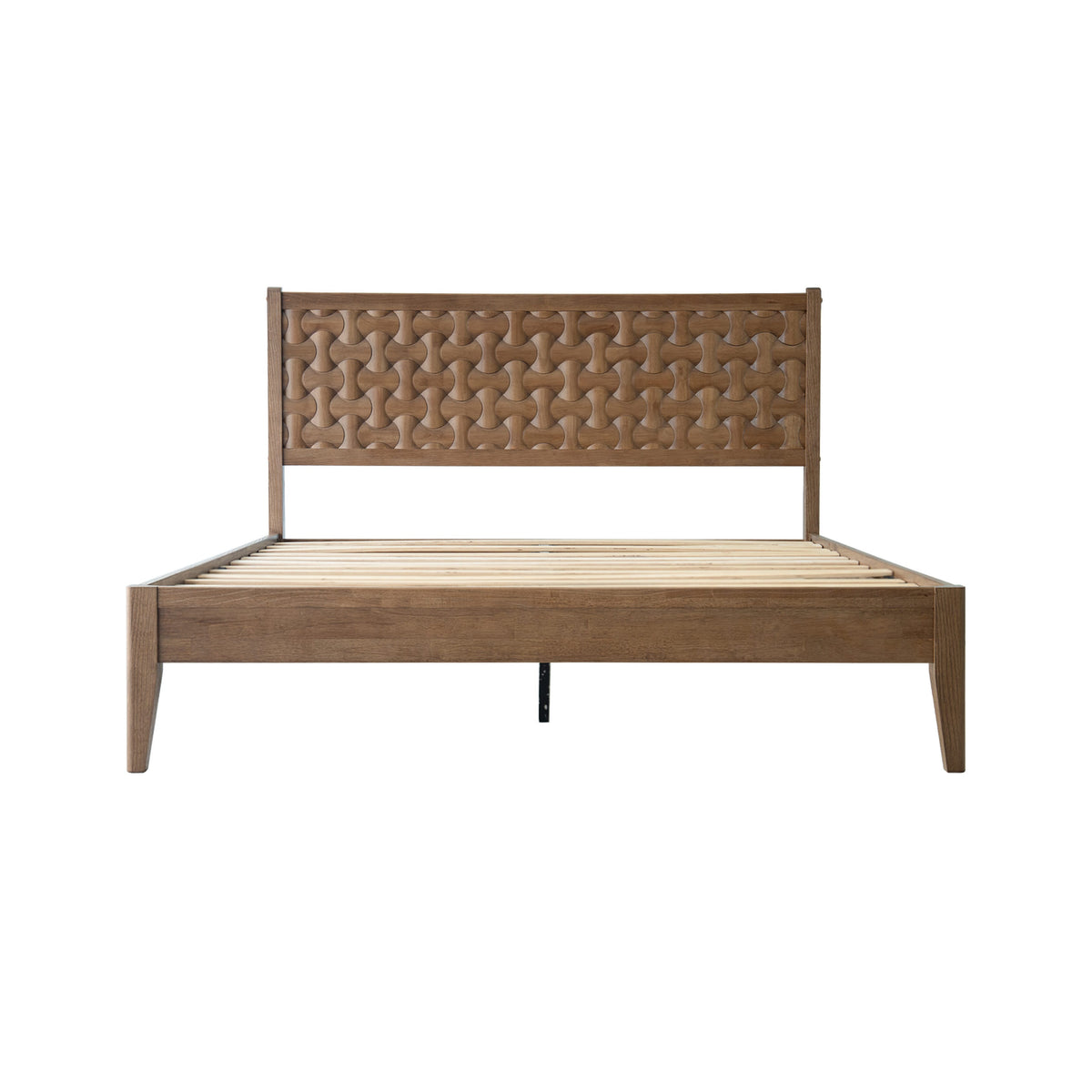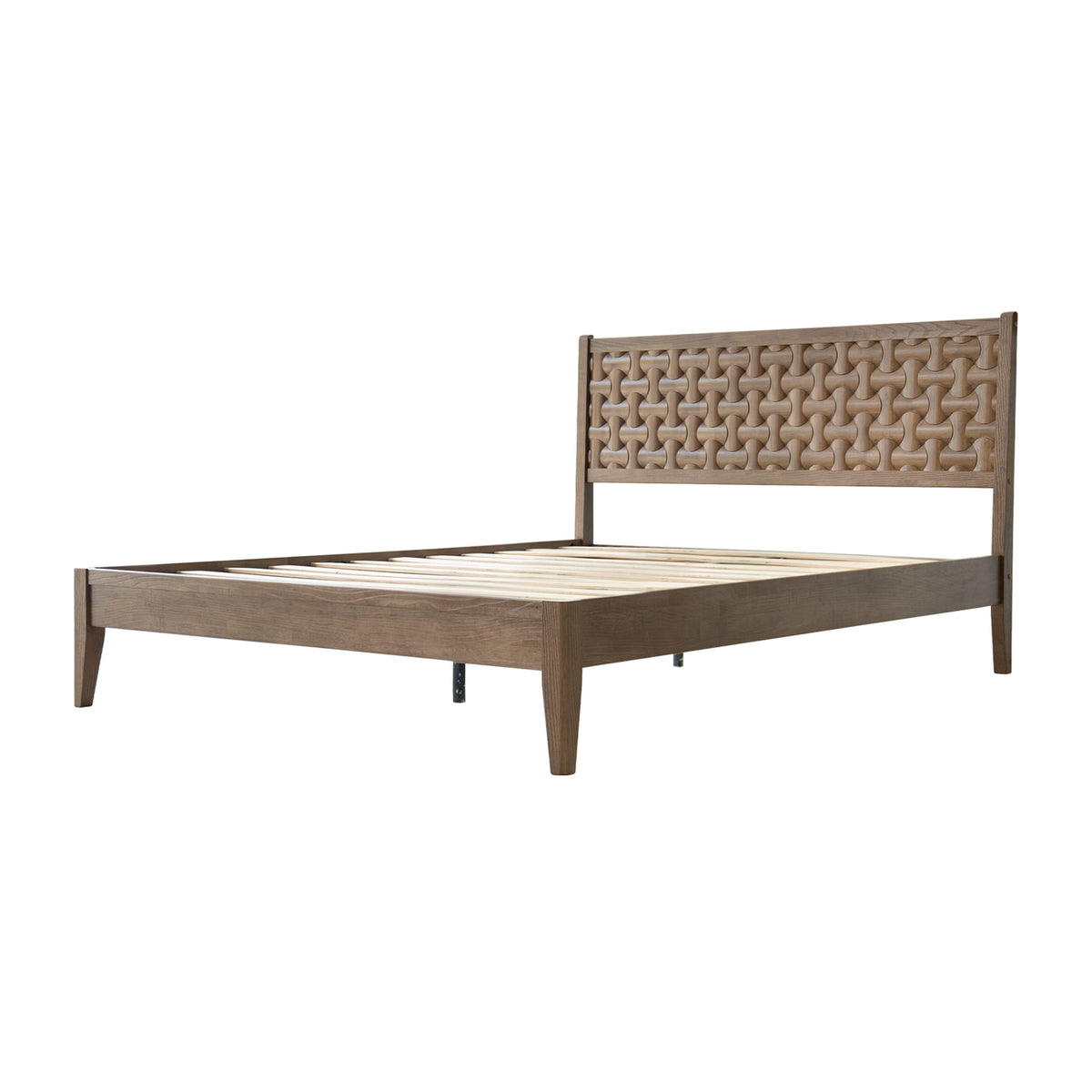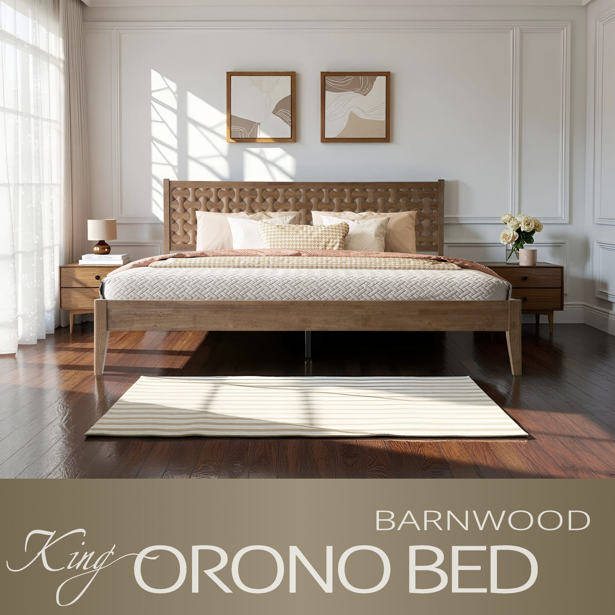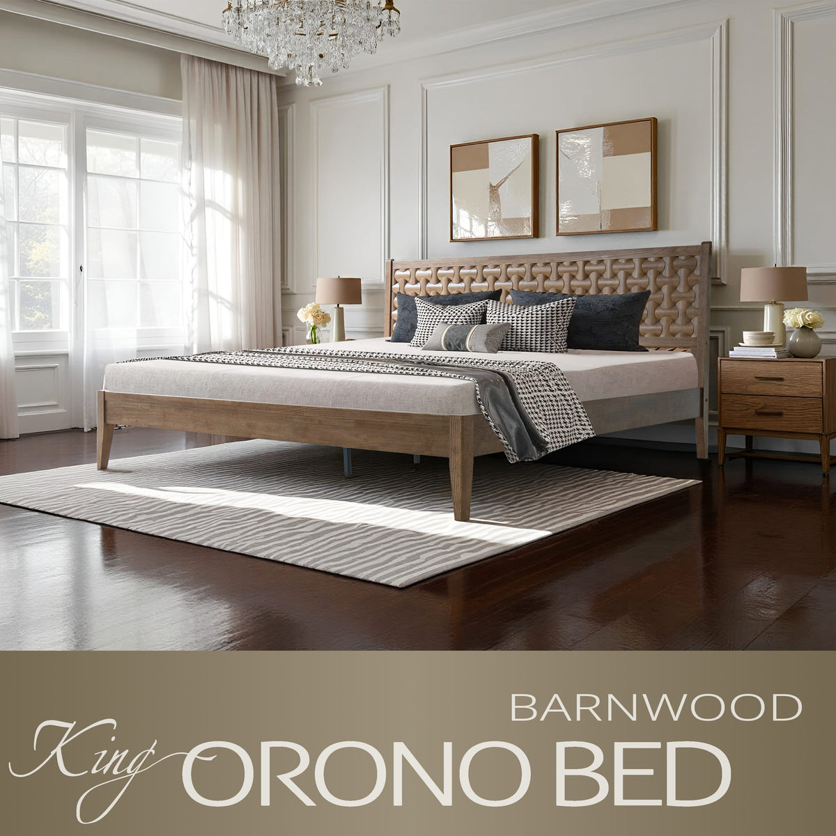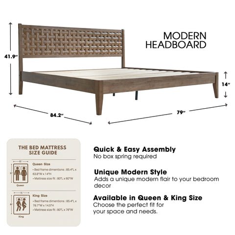 Bring timeless elegance and lasting comfort to your bedroom with the Orono King Bed Frame. Built from 100% solid wood, this platform bed showcases a rich Barnwood finish that enhances the natural wood tone and adds warmth to your home. The beautiful geometric fretwork headboard creates a stylish focal point while providing cozy back support for reading or relaxing. Designed for strength and balance, the Orono platform base includes 12 wooden slats and durable metal legs, offering firm support for up to 800 lbs without requiring a box spring. With 8.3 inches of under-bed clearance, it provides convenient storage space for boxes, baskets, or blankets. The noise-free, anti-slip design keeps your rest calm and undisturbed. Easy to assemble and fully finished on all sides, it delivers a sleek and polished appearance. From smooth corners to tidy screw covers, every element highlights careful craftsmanship. Strong, elegant, and comfortable, the Orono King Bed Frame adds sophistication and warmth to any bedroom.