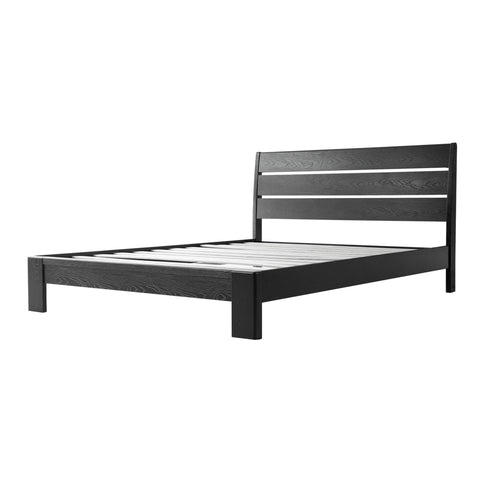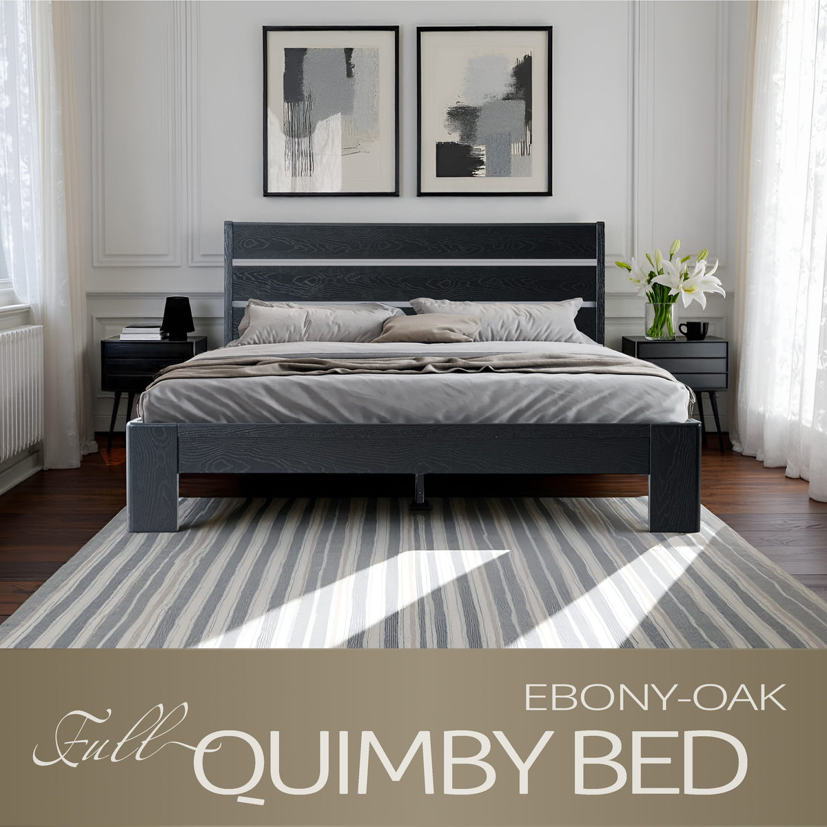 Upgrade your bedroom with the Quimby Full-Size Platform Bed Frame by East West Furniture, combining strength, style, and comfort in one elegant design. Made from 100% solid Para wood, this bed frame offers lasting durability, natural beauty, and timeless appeal. The Ergonomic Ladder Panel headboard delivers a sleek, modern look that fits perfectly with both contemporary and rustic interiors. Finished in a rich Ebony Oak tone, it showcases the natural wood grain while adding warmth and sophistication to your space. Built for stability, the platform bed features 12 sturdy wooden slats reinforced with a metal bar, providing slip-resistant and noiseless support for up to 800 lbs - no box spring required. The 6.3-inch under-bed clearance allows extra storage and easy cleaning. With rounded corners, smooth edges, and flawless finishing, every detail reflects East West Furniture’s superior craftsmanship. Easy to assemble and designed for daily use, the Quimby Platform Bed blends solid wood strength, modern elegance, and functional design to enhance any bedroom.