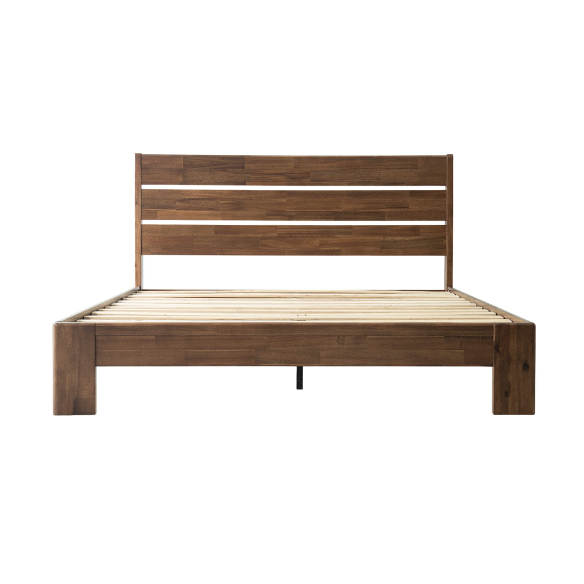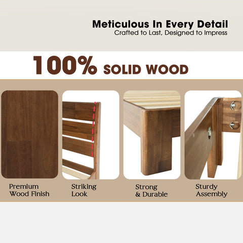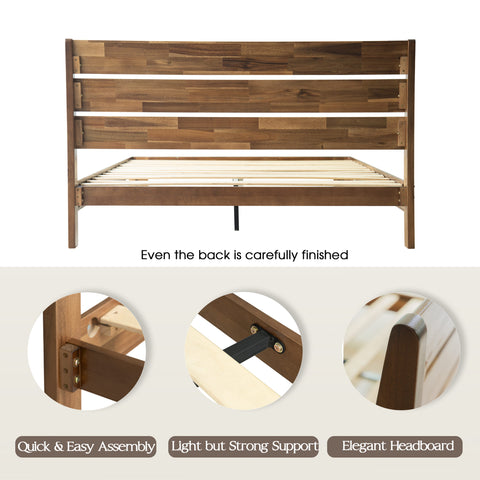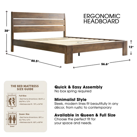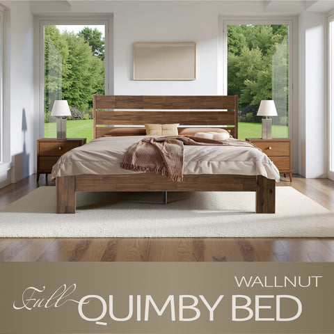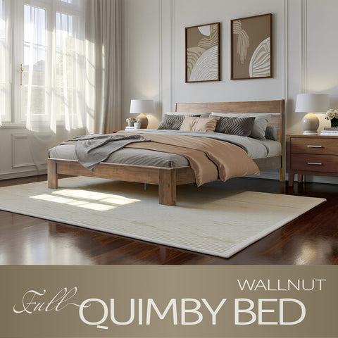 Transform your bedroom into a cozy and elegant retreat with the Quimby Full-Size Platform Bed Frame by East West Furniture. Crafted from 100% solid Para wood, this bed frame ensures lasting durability, natural beauty, and timeless appeal. The Ergonomic Ladder Panel headboard design adds a sleek, modern touch while brightening your space - ideal for both rustic and contemporary interiors. Finished in a rich Walnut tone, it highlights the natural wood grain, creating a warm and sophisticated atmosphere that complements any décor style. Built for long-lasting stability, the bed includes a 12-slat solid wood platform reinforced with metal center legs, offering quiet, slip-free, and strong support for up to 800 lbs - with no box spring required. Its 6.3-inch under-bed clearance allows convenient storage and easy cleaning. With rounded corners, smooth edges, and a refined wood finish, every detail of the Quimby Bed Frame reflects premium craftsmanship. Simple to assemble and made for daily comfort, it blends modern style, strength, and simplicity - creating a perfect centerpiece for your bedroom.