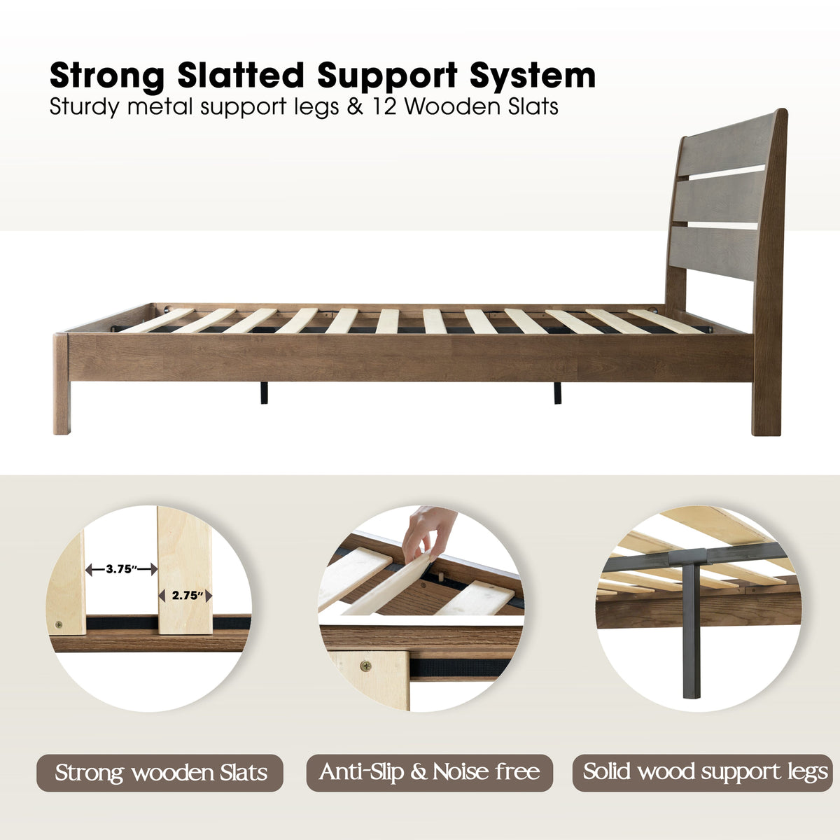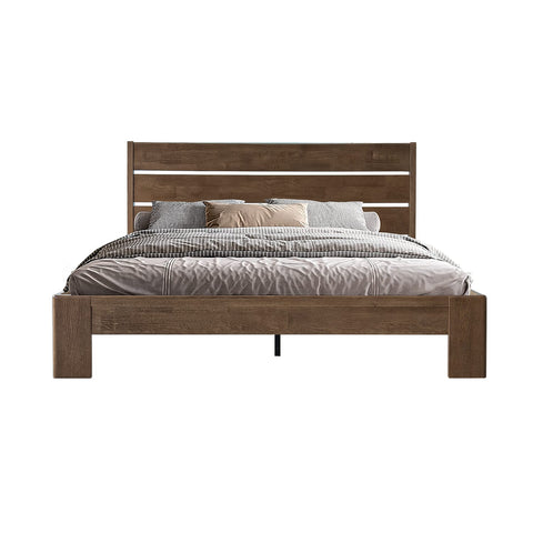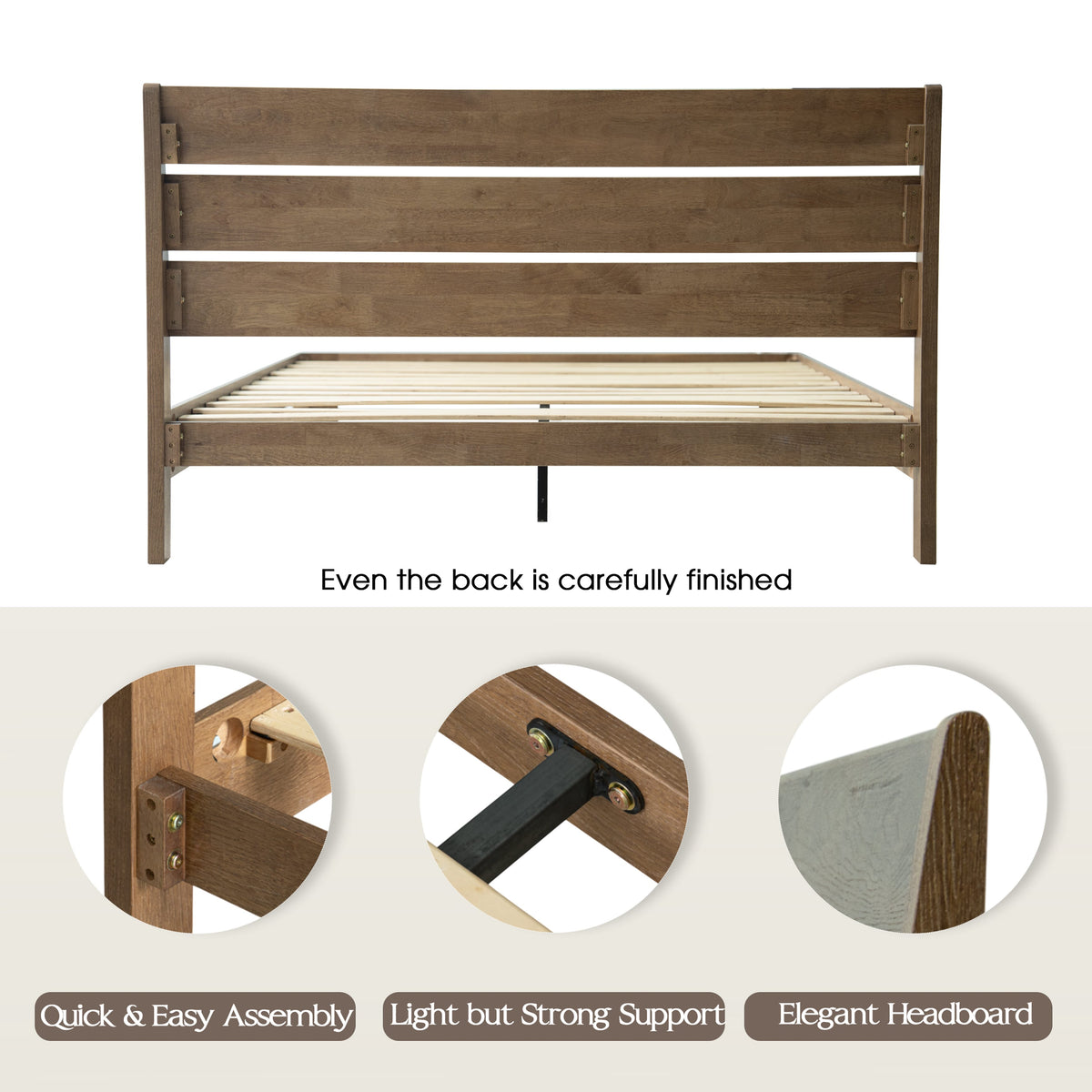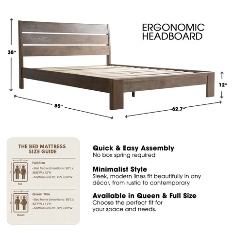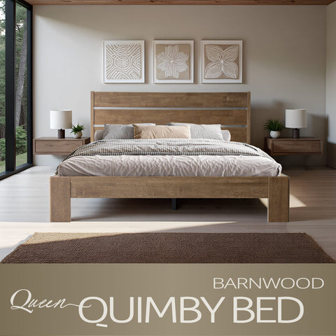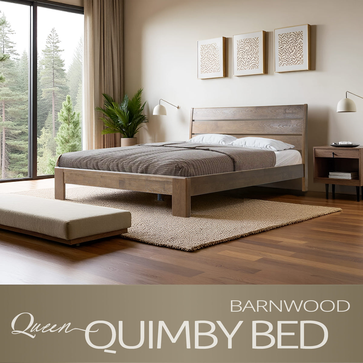 Bring warmth, charm, and durability to your bedroom with the Quimby Queen Size Platform Bed Frame by East West Furniture. Expertly crafted from 100% solid Para wood, this bed frame combines lasting strength with natural beauty and timeless design. The Ergonomic Ladder Panel headboard enhances the modern aesthetic while adding a touch of rustic character that blends effortlessly with both classic and contemporary interiors. Finished in a stunning Barnwood tone, it beautifully showcases the natural wood grain, creating a cozy and inviting atmosphere. Built for stability and comfort, the platform bed includes 12 heavy-duty wooden slats reinforced with metal legs, providing strong, noise-free, and slip-resistant support for up to 800 lbs - no box spring required. The 6.3-inch under-bed clearance offers added storage convenience and easy cleaning access. Every element, from smooth edges to rounded corners and a fine wood finish, reflects East West Furniture’s signature craftsmanship. Simple to assemble and designed for everyday use, the Quimby Platform Bed combines solid wood strength, rustic elegance, and practical comfort to elevate your bedroom décor.