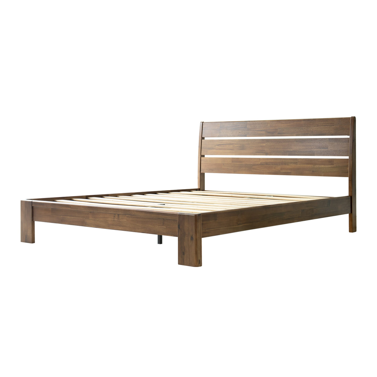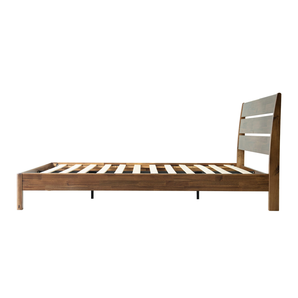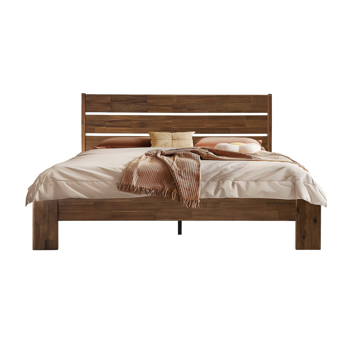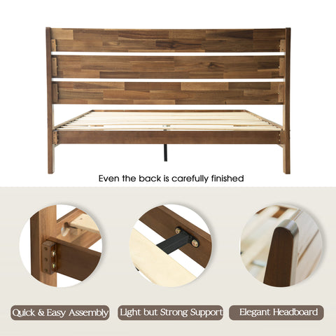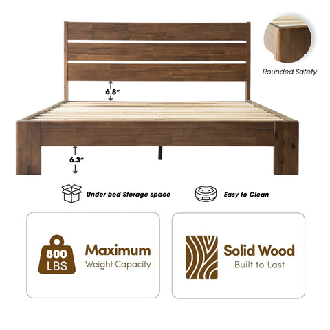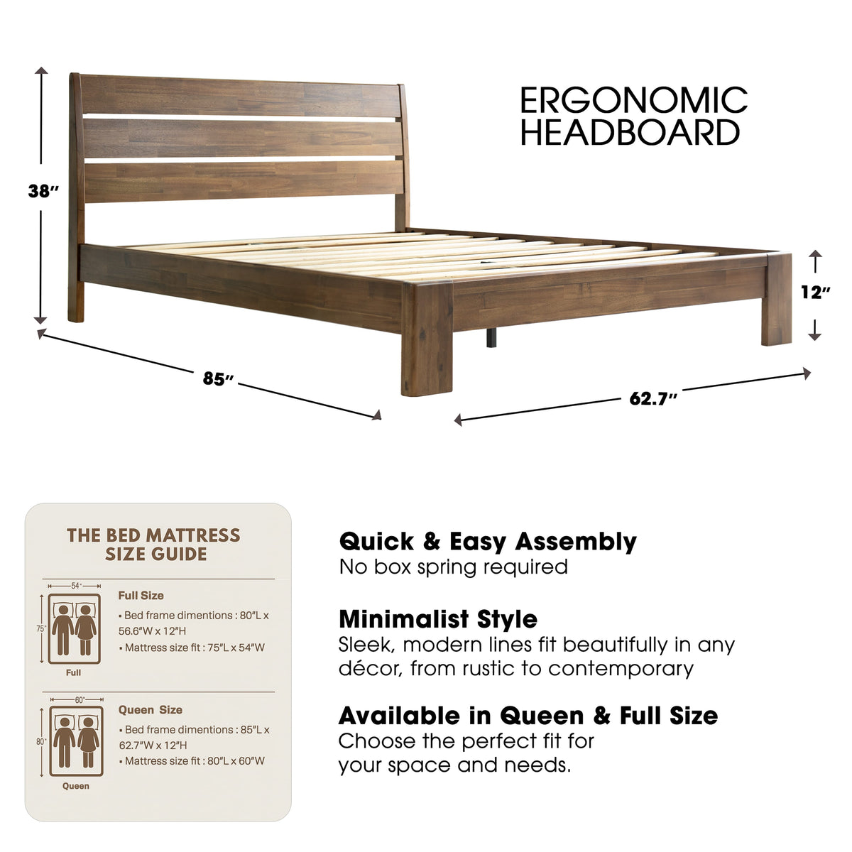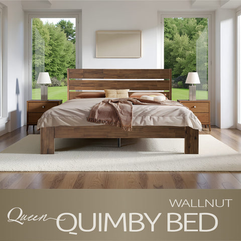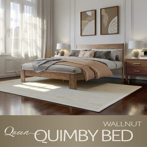 Create a stylish and peaceful bedroom with the Quimby Queen Size Platform Bed Frame, made from 100% solid Para wood for lasting strength, natural beauty, and luxurious charm. The platform bed features an Ergonomic Ladder Panel headboard that adds a clean, modern look and brings a sense of brightness to your space, perfect for both rustic and contemporary interiors. Its Walnut finish enhances the natural wood grain, creating a warm and elegant atmosphere that elevates any bedroom décor. Designed to impress with its beautiful look, strong platform base, and smooth wood finish, the Bed Frame is built to last and upgrade your home with timeless appeal. It includes a 12-slat solid wood platform with reinforced metal center legs, offering stable, quiet, and slip-free support for up to 800 lbs, with no box spring required. The 6.3-inch under-bed clearance provides extra storage and easy cleaning. With rounded corners, smooth edges, and flawless finishing, every part of the Quimby Platform Bed reflects East West Furniture’s quality craftsmanship. Easy to assemble and made for everyday use, the Bed Frame blends modern style, solid wood strength, luxurious comfort, and simplicity, creating a bright, cozy, and well-balanced centerpiece for your bedroom.