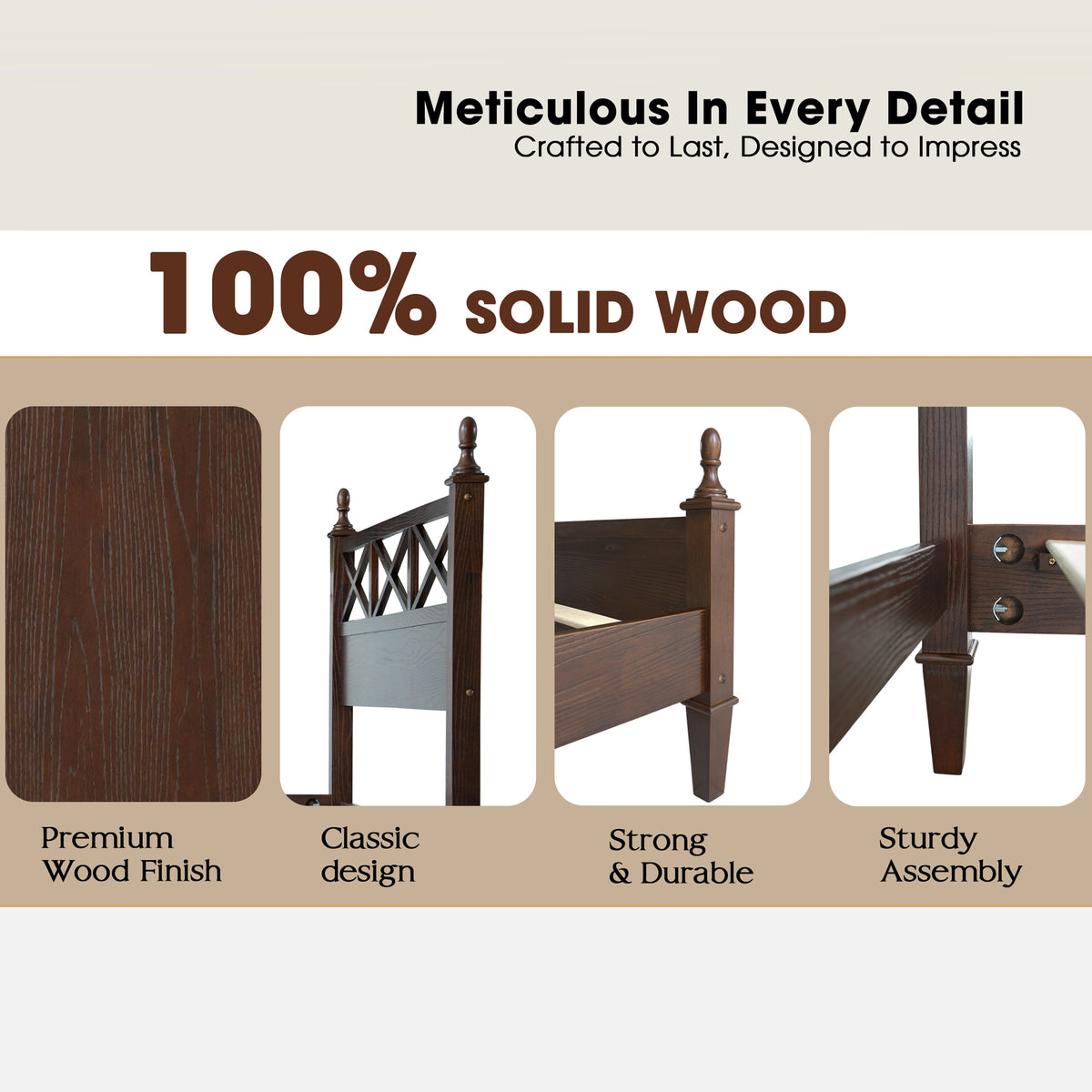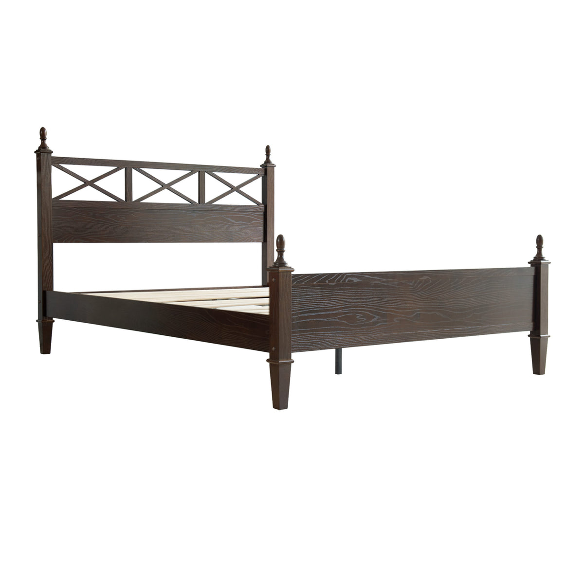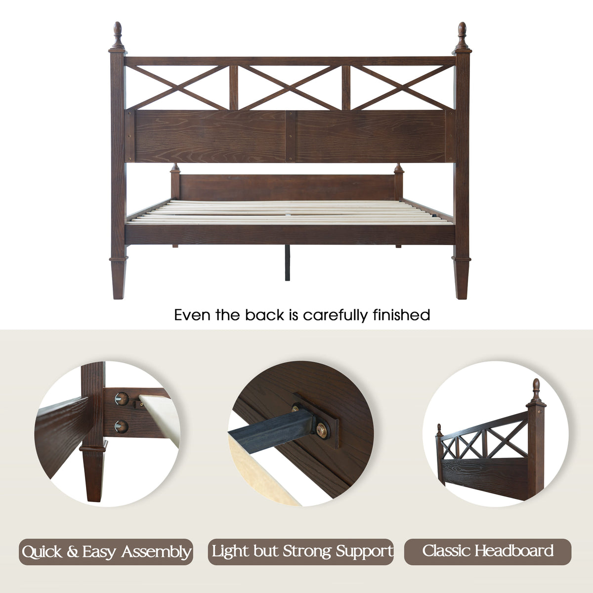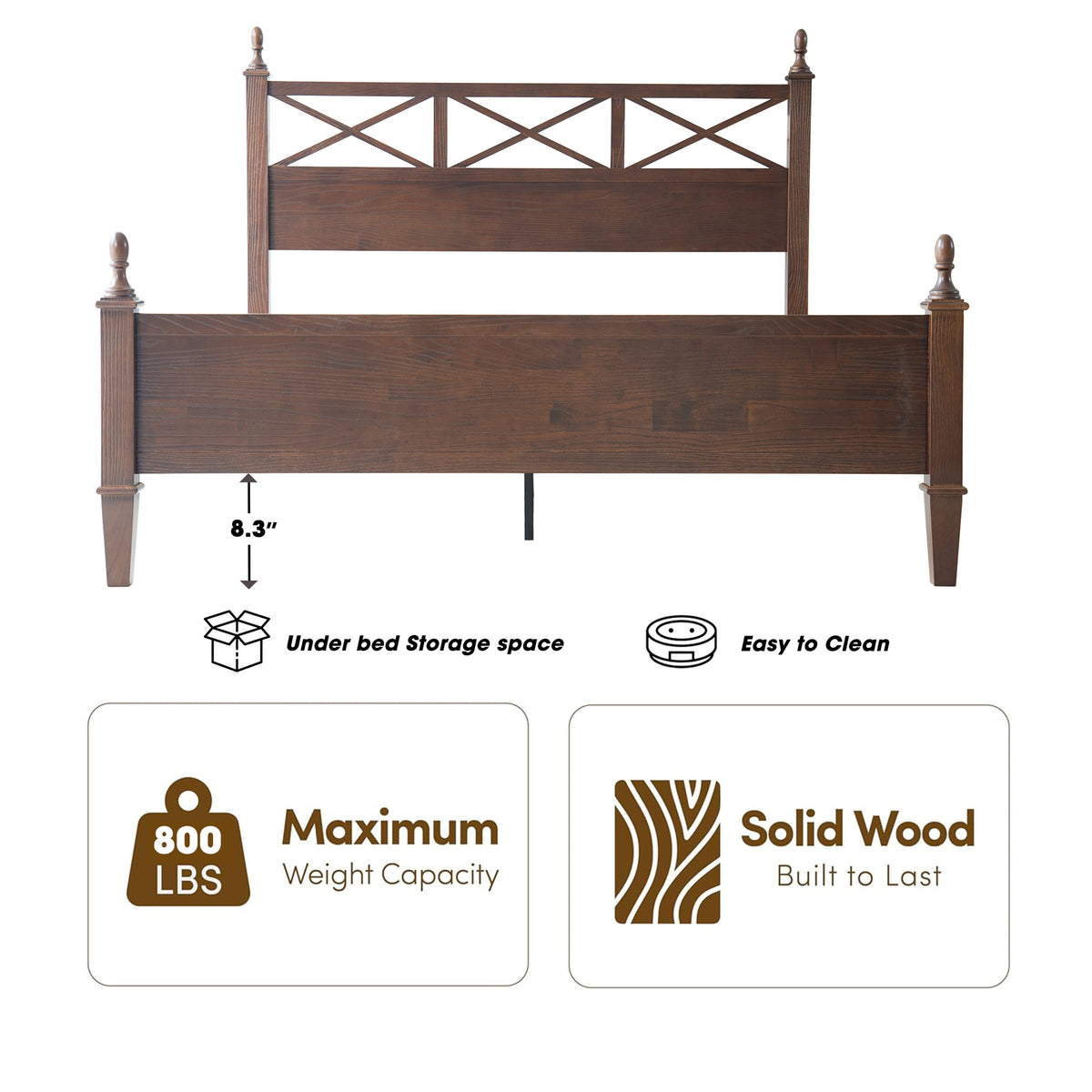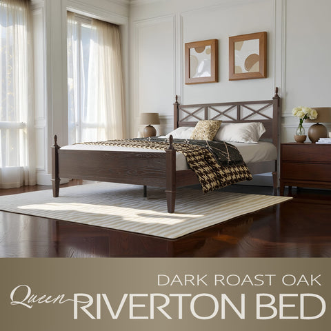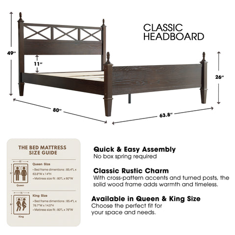 Transform your bedroom with the rustic elegance and lasting appeal of the Riverton Queen Size Bed Frame. Expertly crafted from 100% solid Hevea wood (Rubberwood), this platform bed reflects East West Furniture’s dedication to quality, durability, and timeless design. The Dark Roast Oak finish beautifully highlights the natural wood grain, bringing warmth and sophistication to both modern and traditional interiors. The headboard features a charming cross-pattern design with turned posts, adding a touch of refined farmhouse style to your space. Designed for strength and stability, the Riverton Bed includes 12 durable wooden slats, reinforced metal support legs, and a solid wood frame - providing a sturdy, noise-free, and slip-resistant foundation that ensures peaceful nights and long-lasting use. With 8.3 inches of under-bed clearance, this platform bed also offers practical storage or easy access for cleaning. Every detail - from the smooth edges to the precisely finished back panel - showcases the thoughtful craftsmanship and elegant design that define East West Furniture.