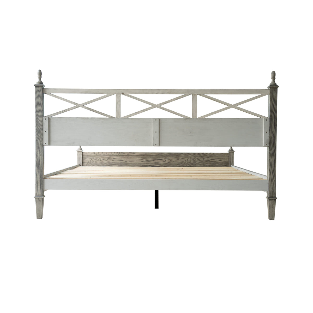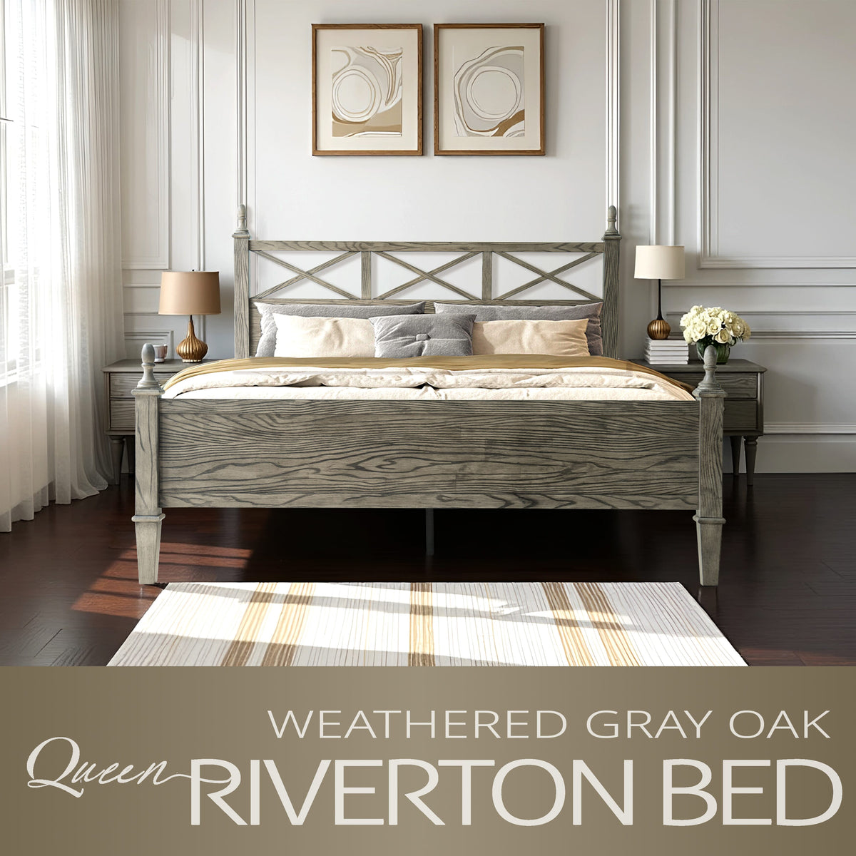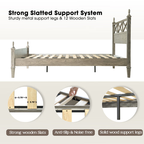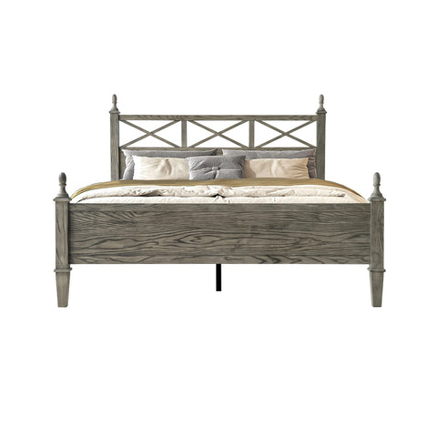 Add rustic charm and modern appeal to your bedroom with the Riverton Queen Size Bed Frame by East West Furniture. Constructed from 100% solid Hevea wood (Rubberwood), this bed delivers both strength and timeless elegance. The Weathered Gray Oak finish beautifully highlights the natural texture of the wood grain, creating a cozy yet sophisticated look that complements a variety of interior styles. The headboard features a cross-pattern design with turned posts, offering a farmhouse-inspired touch with a refined edge. Built for lasting performance, the Riverton Bed includes 12 sturdy wooden slats, reinforced metal legs, and a solid wood structure - ensuring excellent stability and a noise-free, non-slip foundation for restful sleep. Designed with 8.3 inches of under-bed clearance, it provides convenient storage space and easy cleaning access. Every detail, from the smooth edges to the finely finished back panel, reflects East West Furniture’s dedication to craftsmanship, durability, and style.