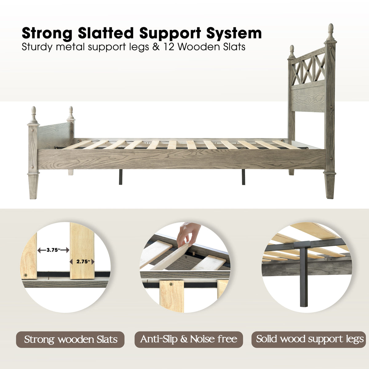 • Platform Support: 12 Wooden Slats + Reinforced Metal Legs