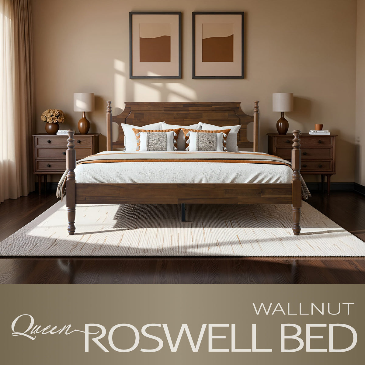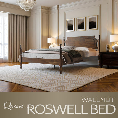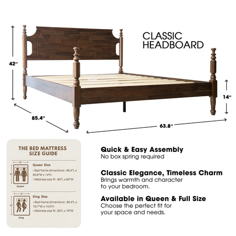 Enhance your bedroom with the Roswell Queen Size Bed Frame, a graceful blend of timeless elegance and enduring quality. Crafted from 100% solid wood, this beautifully designed bed ensures durability and a classic appearance that never goes out of style. The antique-inspired headboard and footboard feature refined carved details and smooth edges, adding a touch of traditional charm to your space. The rich Walnut finish highlights the natural wood grain, bringing warmth and sophistication to any décor. Built with a 14-inch solid wood platform base, it includes 12 sturdy wooden slats and reinforced metal center legs that provide stable, noiseless, and slip-free support - no box spring required. With 8.3 inches of clearance underneath, it offers convenient storage and easy cleaning. Every element of the Roswell Bed reflects East West Furniture’s dedication to craftsmanship, comfort, and design excellence. Enjoy a stylish, durable, and restful centerpiece for your bedroom.