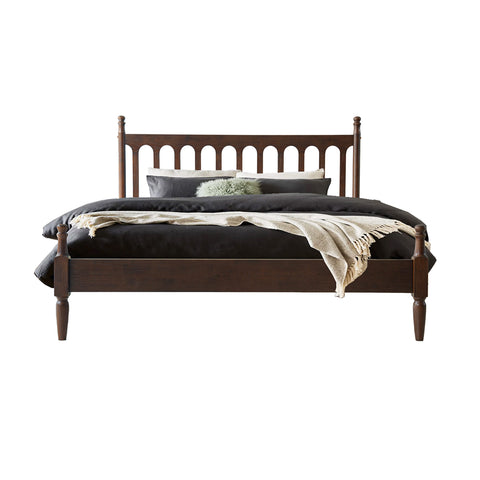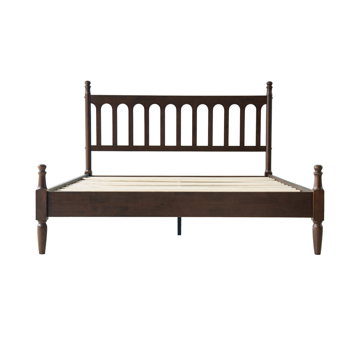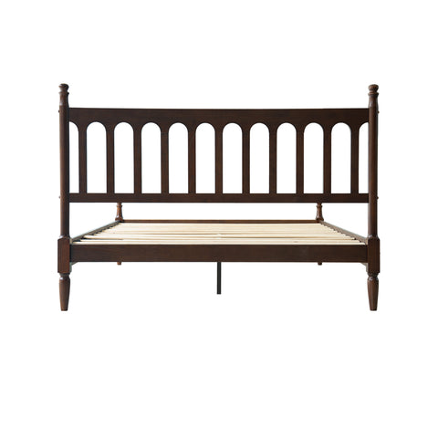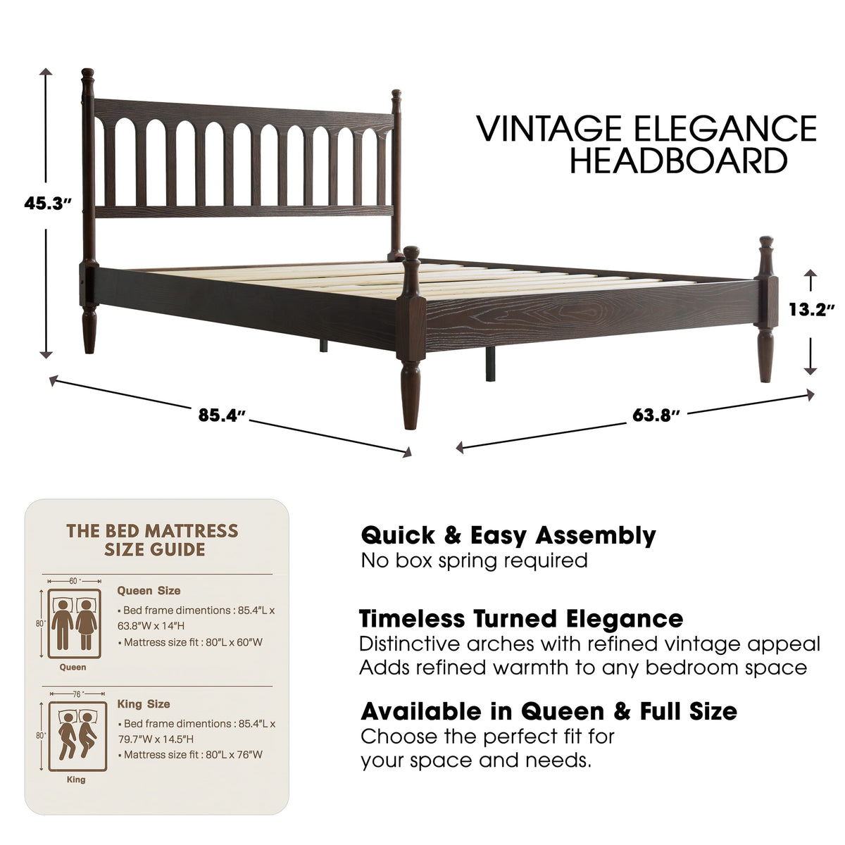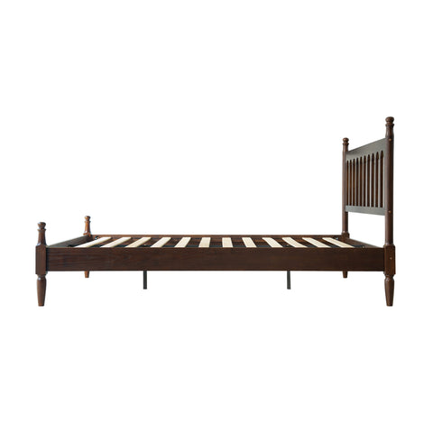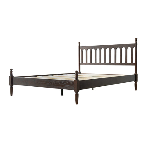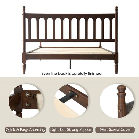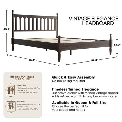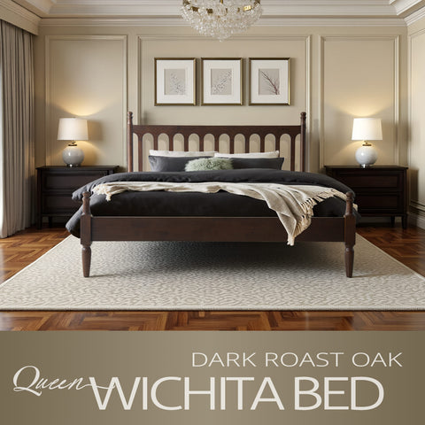 Enhance your bedroom with the classic appeal and sturdy craftsmanship of the Wichita Queen Size Bed Frame. Built from 100% solid wood (Rubberwood), this platform bed delivers lasting durability and natural beauty. The elegant Dark Roast Oak finish paired with a Vintage Elegance Style headboard and footboard design creates a warm, timeless look that blends effortlessly with any décor. The Wichita Bed Frame is equipped with 12 solid wooden slats and metal center legs, ensuring strong mattress support, stability, and a weight capacity of up to 800 lbs. Its anti-slip and noise-free structure guarantees a peaceful, restful night’s sleep without the need for a box spring. With 9.6 inches of under-bed clearance, you’ll have convenient storage space for boxes, luggage, or seasonal items. Crafted with precision and attention to detail, this bed frame features smooth edges, concealed screw covers, and a carefully finished back - showcasing East West Furniture’s dedication to quality and style. Simple assembly with included tools ensures quick setup and long-lasting use.