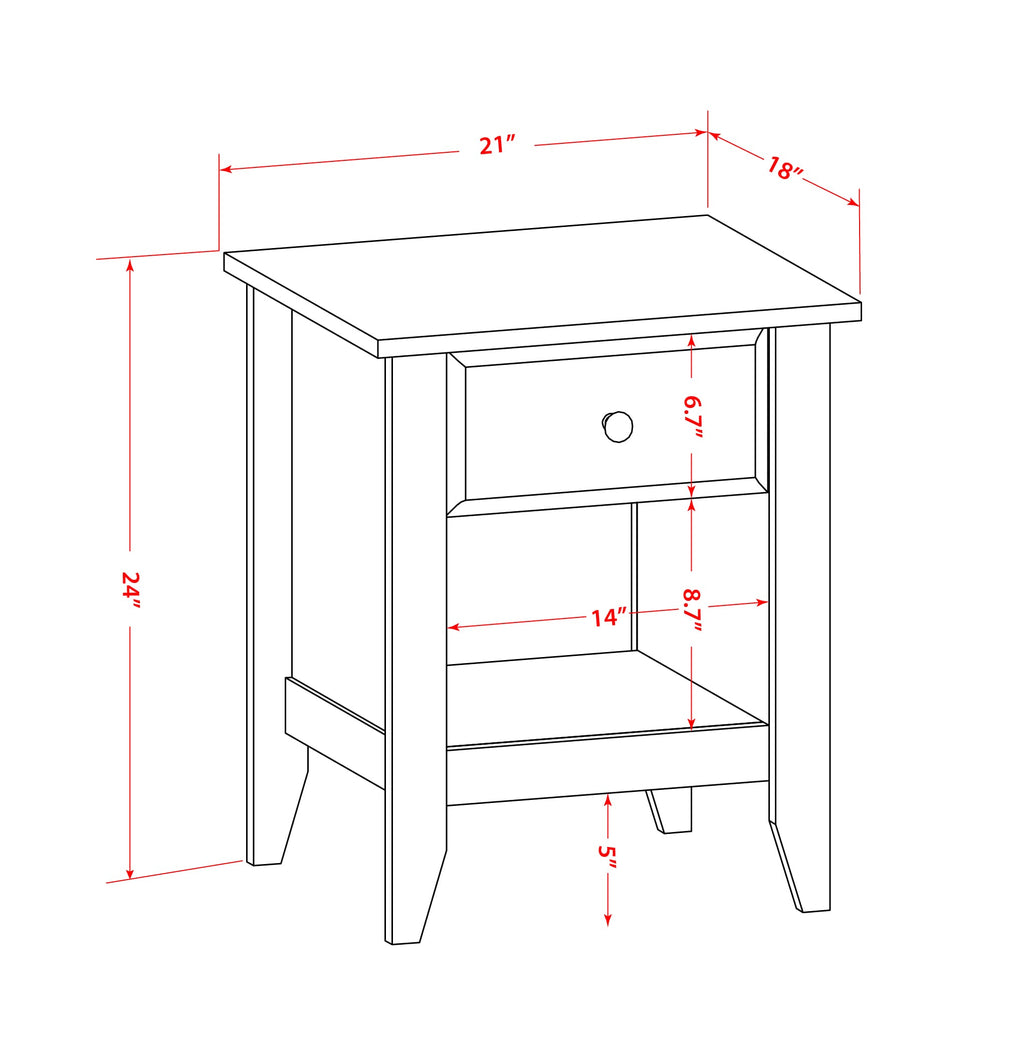 - Night Stand Dimensions: Length: 21; Width: 18; Height: 24.
