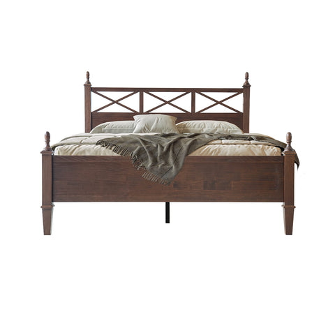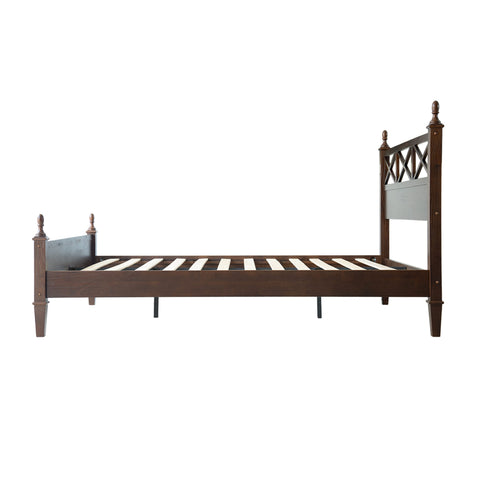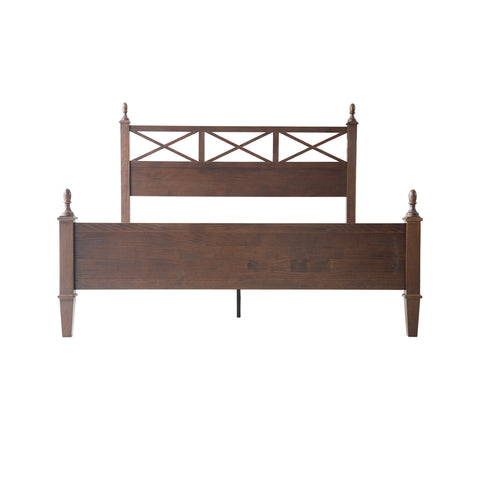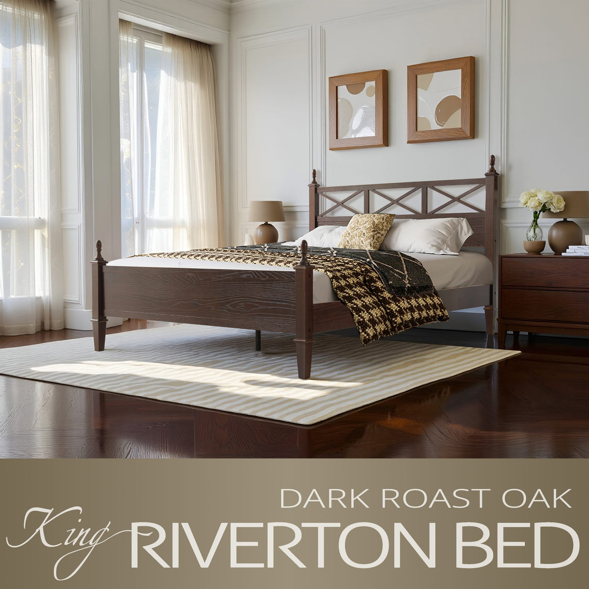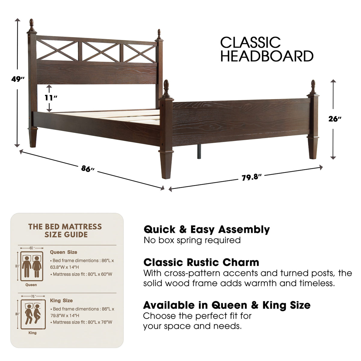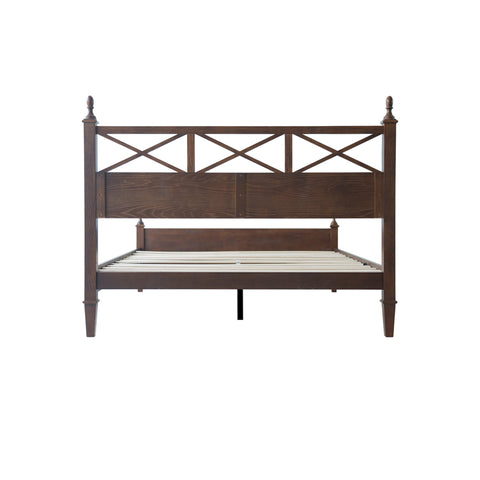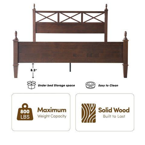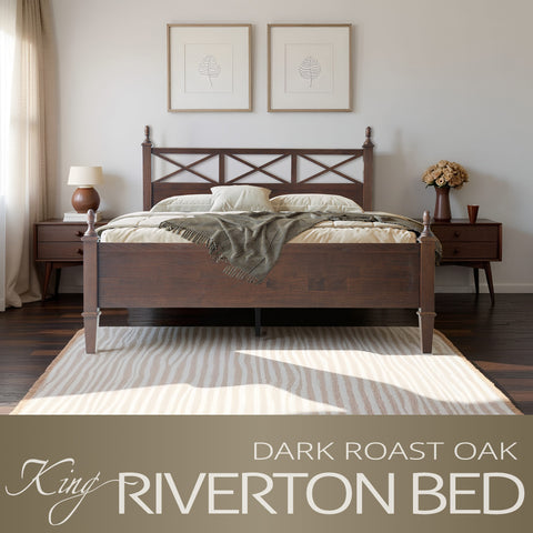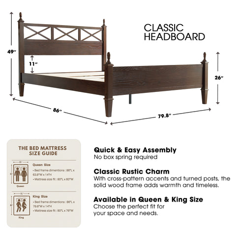 Enhance your bedroom with the rustic sophistication and enduring charm of the Riverton King Size Bed Frame. Made from 100% solid Hevea wood (Rubberwood), this platform bed exemplifies East West Furniture’s commitment to exceptional craftsmanship and long-lasting quality. The Dark Roast Oak finish accentuates the natural wood grain, bringing warmth and elegance to any décor - whether modern, rustic, or traditional. The headboard features a beautiful cross-pattern design with turned posts, creating a refined farmhouse aesthetic that elevates your space. Designed for stability and quiet comfort, the Riverton Bed includes 12 sturdy wooden slats, reinforced metal support legs, and a solid wood frame that provides a strong, noiseless, and slip-free foundation - no box spring required. With 8.3 inches of under-bed clearance, it also offers convenient storage or easy cleaning access. Every element, from the smoothly finished back panel to the precisely rounded edges, highlights the expert design and attention to detail that define East West Furniture.
