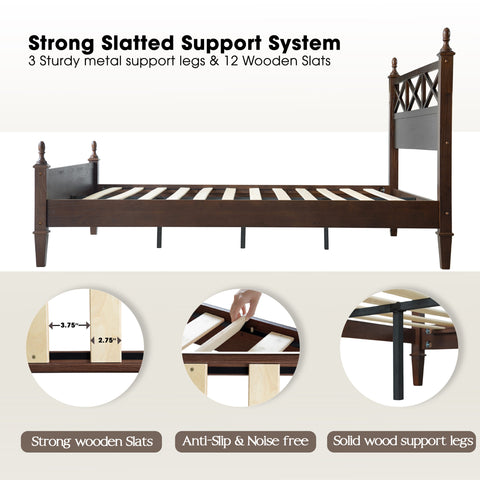 1 King Size Bed Frame with Headboard, Footboard, 12-Wooden Slats, and Reinforced Metal Center Legs.