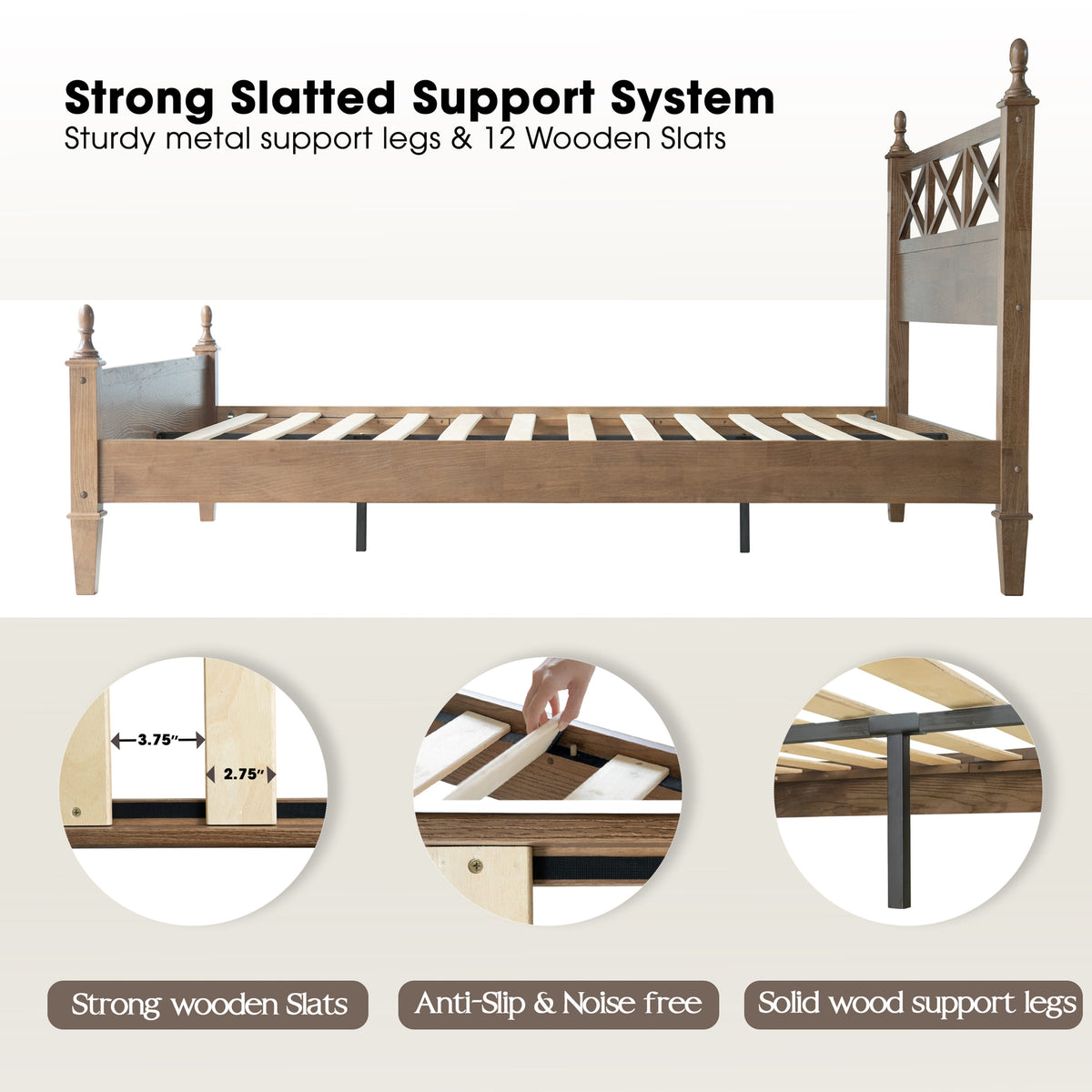 1 Queen Size Bed Frame with Headboard, Footboard, 12-Wooden Slats, and Reinforced Metal Center Legs.